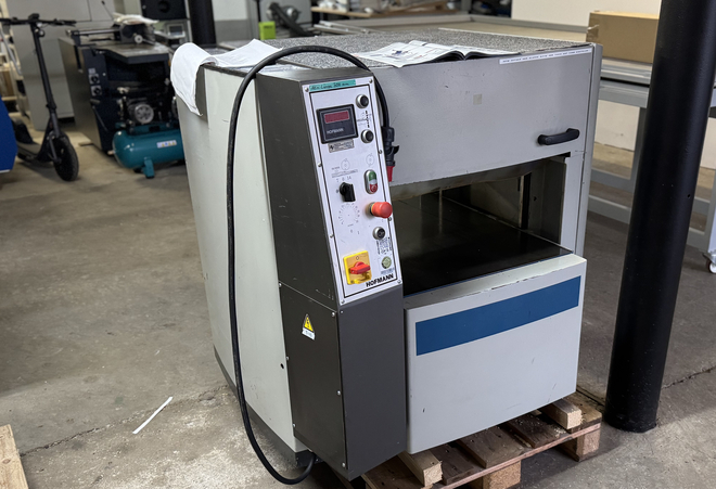HOFMANN AHW 500 YOC 1991 Potência do motor: 4,0 kW Corrente nominal: 9,5 A Largura máxima de plaina: 510 mm Eixo da faca TERSA (eixo de 4 facas) Paragem auxiliar integrada Proteção do eixo da faca SUVAMATIC Tira de união com trilho de fixação Comprimento da mesa: 300 cm Altura da mesa: 84 cm Bocal de sucção: 140 mm 4 peças novas facas Correia de transmissão renovada O sistema elétrico foi renovado pelo antigo proprietário A máquina não tem travão de motor. Dimensões de transporte (dimensões aproximadas): L: 312 cm L: 140 cm H: 115 cm Peso aprox. 900 kg