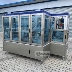 Máquina móvil multiformato para el llenado y cierre de viales y frascos con sistemas de cierre variable: - Tapa de prensa de la estación Pick & Place, incluida la unidad transportadora de ARN correspondiente del vibrador (alimentador vibratorio) - Tamaño del envase: hasta 250 ml. Sistema que incluye plato giratorio de alimentación, sistema de dosificación FLEXICON, sistema de taponado, sistema de control SIEMENS Simatic, etc.