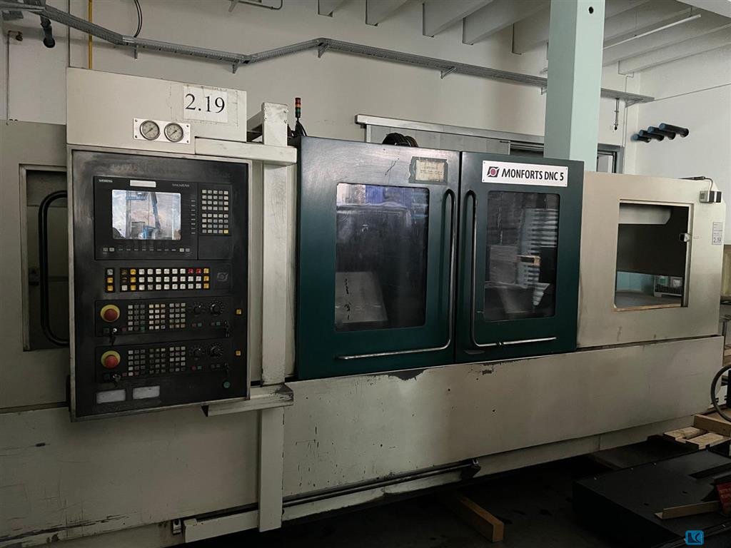 Machine Details Stock-No. 1105-04060 Type of machine CNC Lathe Make MONFORTS Type DNC 5 Year of manufacture 1995 Type of control CNC Storage location HAGUENAU Country of origin Germany Delivery time immediately Freight basis ex works Price Technical details turning diameter 520 mm turning length 600 mm control Siemens type 840 C Spindle Passage 85 mm Spindle diameter 130 mm swing diameter 560 mm Tool changer 12 Tool changer 12 turning speeds 32-4000 rpm weight of the machine approx. 13 t dimensions of the machine approx. 4.5x5.5x2.1 m Additional information Machine is equipped with a counter spindle. lots of accessories CNC SIEMENS 840 C