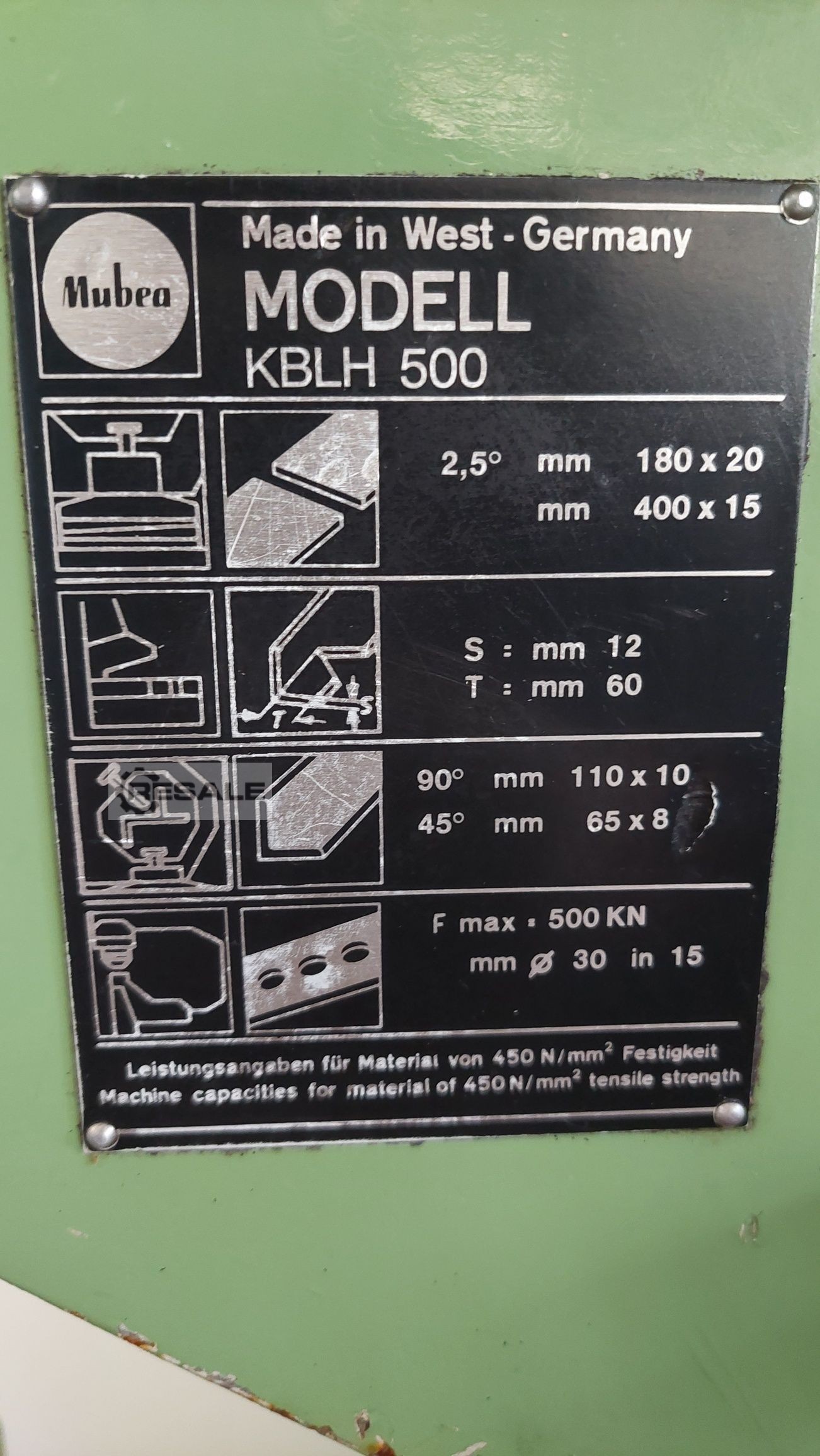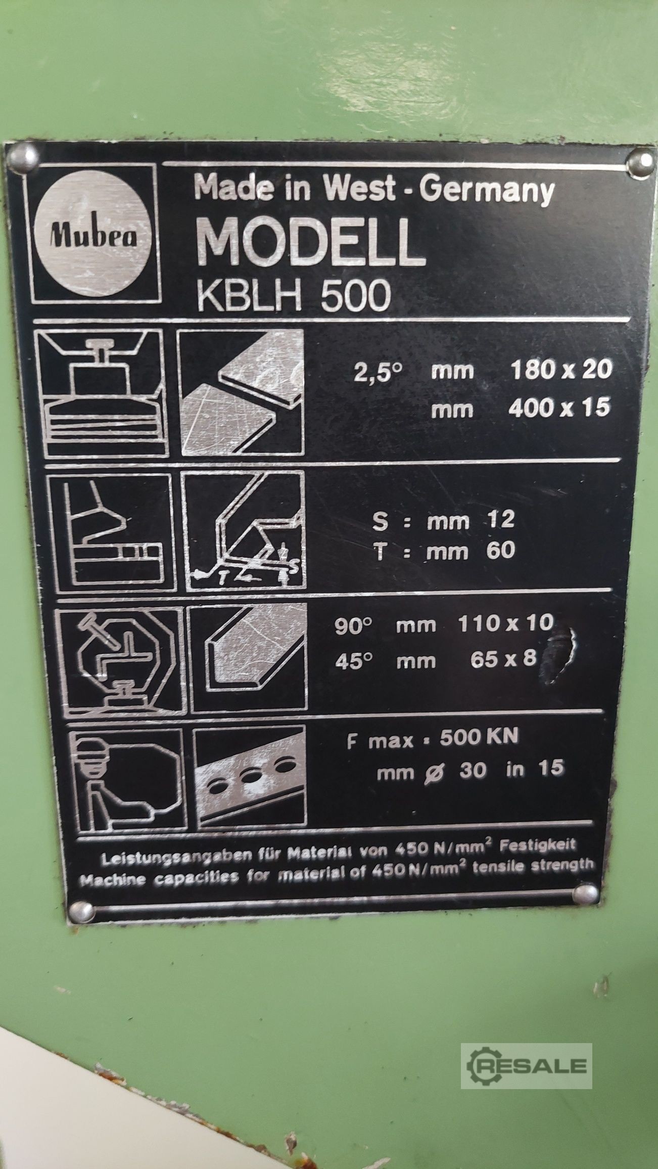 Bearing number: 3488 Profile steel shears Manufacturer: Mubea, Type: KBLH 500 Machines NR.: 0156085927332, Year of construction: 0 Specifications: Size Printl 50 To Max punching dia 30 x 15 mm mm Stroke length 0-60 mm Number of strokes per min. 16 Extension 410 mm Flat steel 180 x 20 - 400 x 10 mm Angular steel 50 mm Round steel 55 mm Total power 7.5 kW Hydraulic. Length: 1400 mm, Height: 1800 mm, Width: 800 mm, Weight: 1800 kg