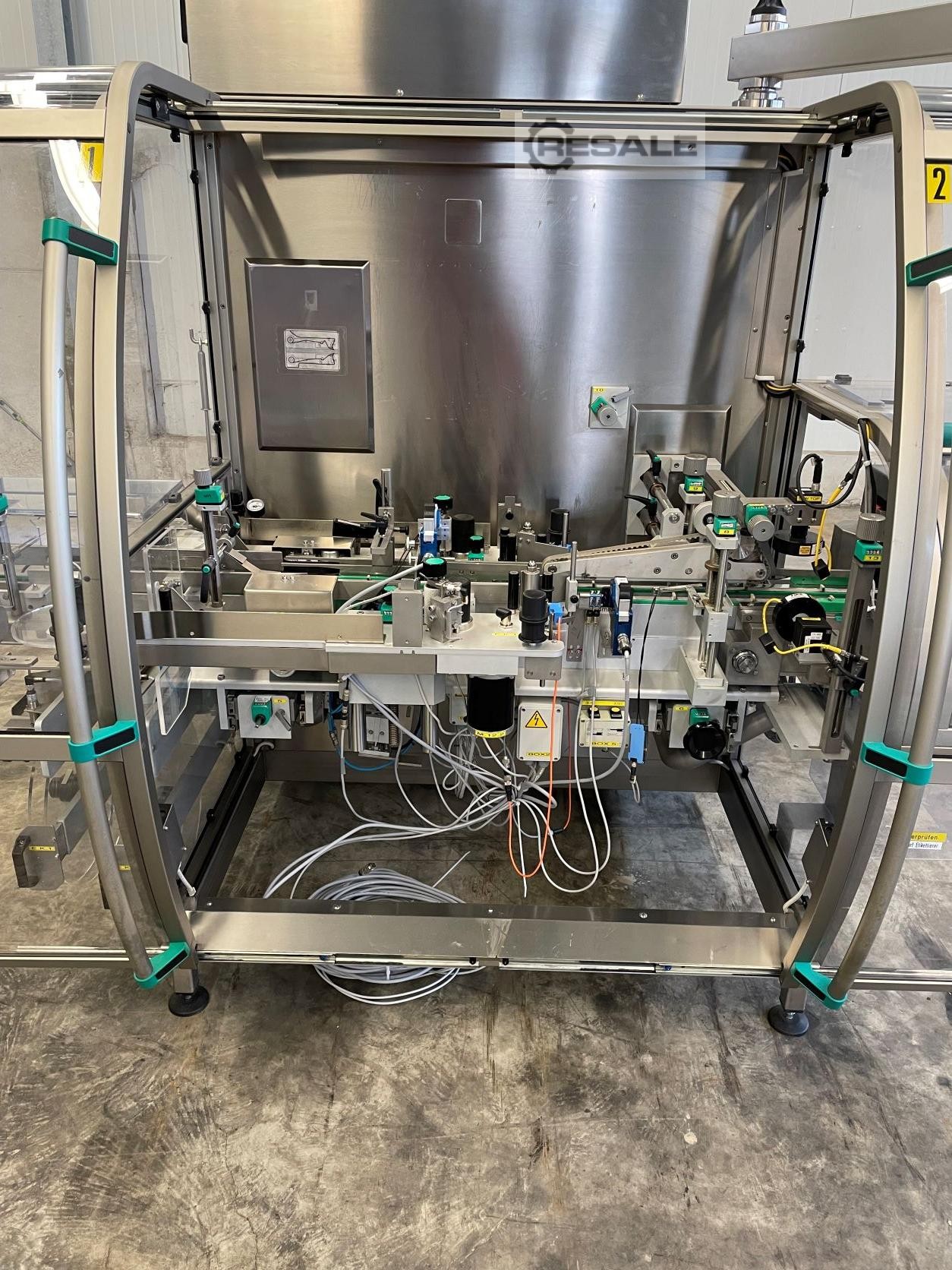 Etiquetador autoadhesivo Neri BLB 400 V2T para aplicar etiquetas en la parte superior e inferior de los envases de cartón con 2 dispensadores de etiquetas. Rango de tamaño de la caja: mín. 20 x 15 x 70 mm, máx. 180 x 120 x 200 mm. Diámetro del rollo de etiqueta max 400 mm, núcleo de rollo de etiqueta 40 mm. Controlador PLC Siemens SIMATIC S7-300 con panel táctil Siemens Eléctrica 400 V/ 50 Hz, máx. dibujar 4 KW, aire comprimido 6 bar Altura de alimentación 820 bis 950 mm Dimensiones de la máquina aprox. 2500 x 2000 x 2250 mm (lxwxh), peso aprox. 1000 Kg, Salida de hasta 200 cajas por minuto (2 máquinas disponibles)