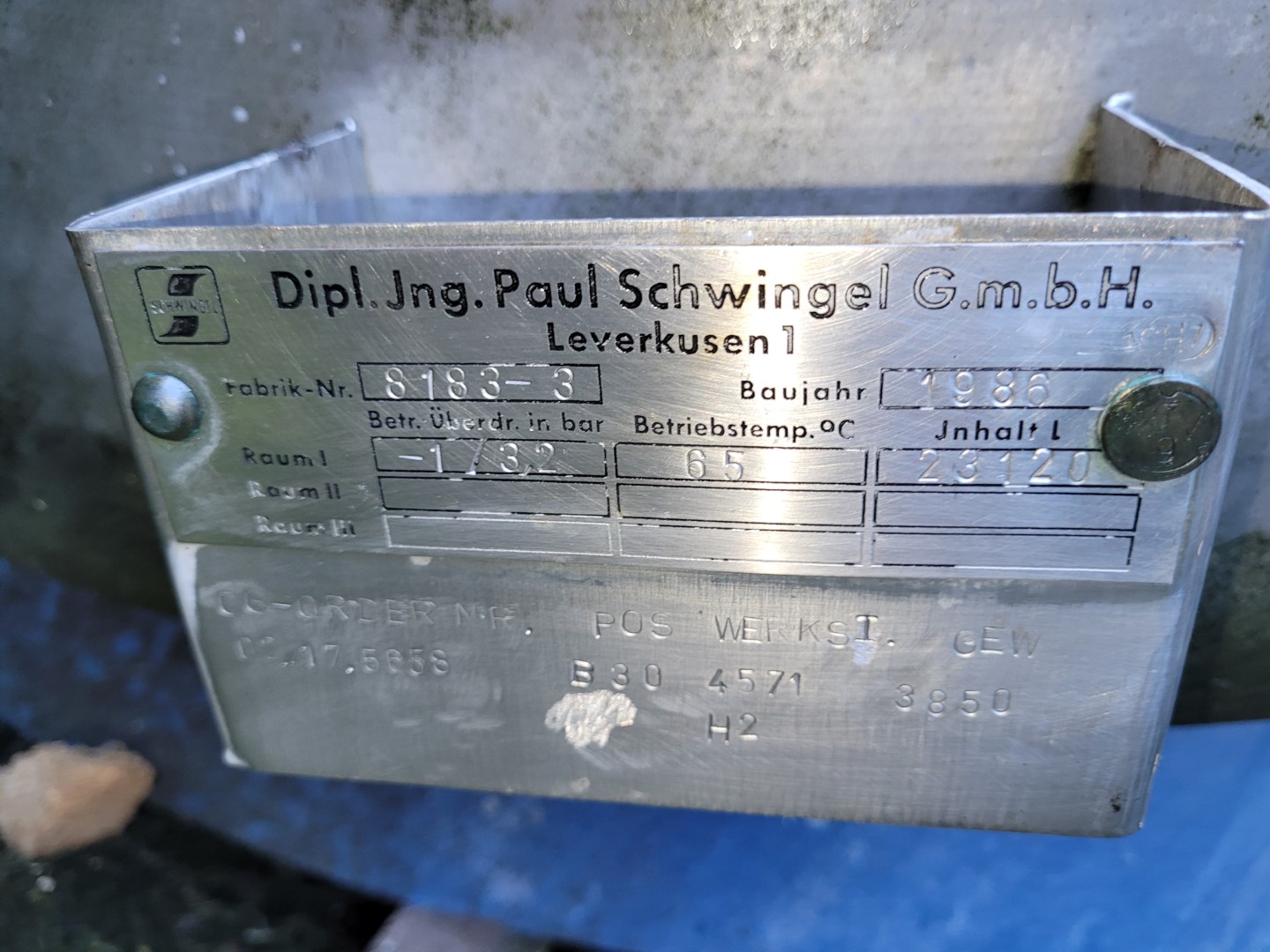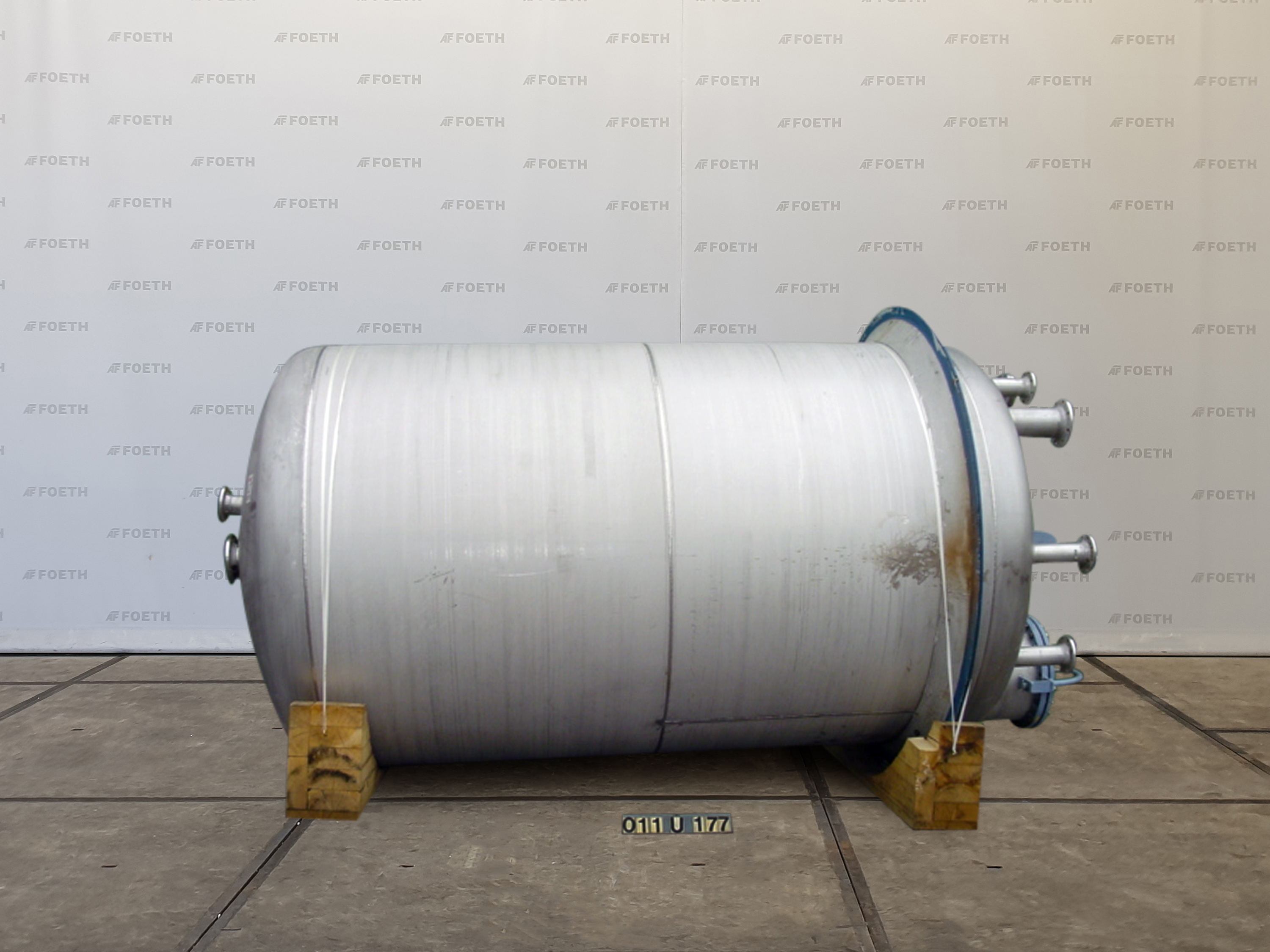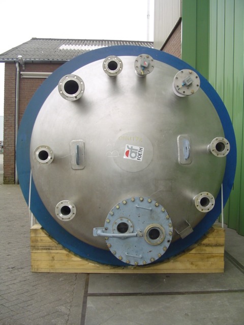 General SKU011U177 MakePaul Schwingel No.8183-3 Year of construction1986 LocationBarneveld Pressure Working pressure3.2 Bar Vacuum possiblecheck Number of vertical pressure tanks1 Main Features MaterialStainless steel Volume23120 Ltr. Pressure3.2 Bar Vacuumcheck Specified Features - Pressure vessel MaterialStainless steel 1.4571 (316Ti) Capacity23.120 l Vessel sizesdia. 2400 x 4000mm Dished topcheck Dished bottomcheck Manholedia. 600mm Top connections6x dia. 100mm + 2x dia. 150mm Outletdia. 150mm + dia. 100mm Max. temperature65 °C Information Floorspace2,8 x 2,8 m Total height5,5 m Weight4800 kgDiscountPressure vesselsPaul SchwingelDiscountTanks > Pressure vesselsBrand > Paul Schwingel What you can expect from Foeth: -- Machine is in working condition -- At a reduced price compared to new -- Ready for shipping to any destination worldwide -- You are welcome ...