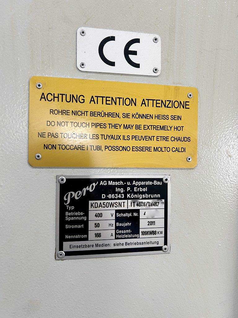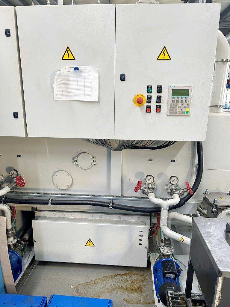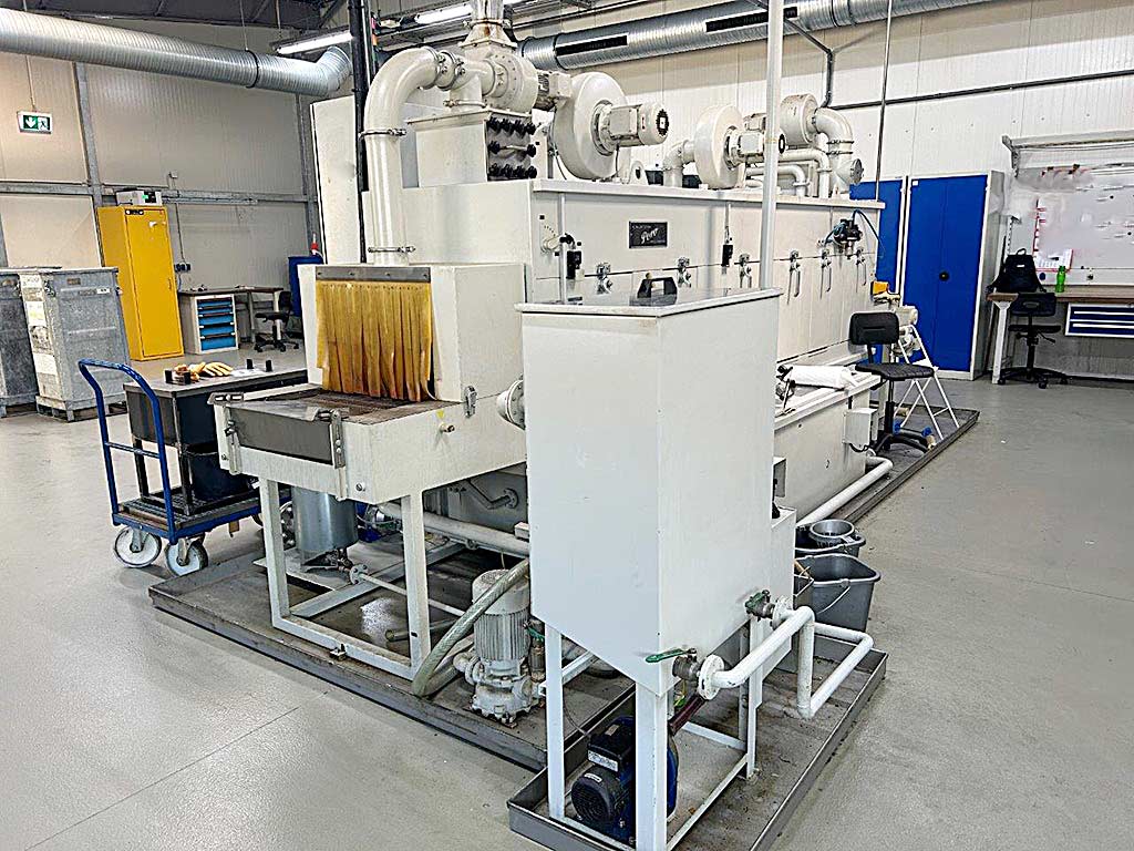 An industrial multi-bath continuous spray cleaning system Pero for components is available. Belt width: 500mm, clearance height: 300mm, max. belt load: 40kg/m, loading height: 900mm, belt speed: 2.8m/min, cleaning volume flow: 320l/min, cleaning pressure: 2bar, machine dimensions X/Y/Z: approx. 5100mm/2100mm/2300mm. Documentation available. An on-site inspection is possible.