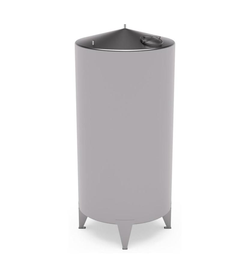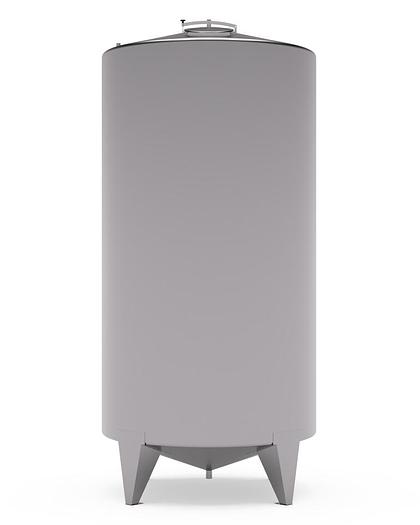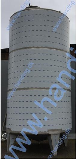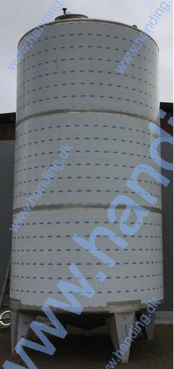 New 25.000 litre tank, Stock number: T25B6-1, Litre: 25.000, Material: Stainless acid proof steel AISI 316, Item: Tank, Standing: 4 pcs. legs, Top: Conical 15°, Bottom: Conical 20°, Tank cover: In the top, Ø 500 mm., Pipes: Top Ø 1½ and Ø 4 - Bottom Ø 2½ , Inner diameter: Ø 2600 mm., Cylinder: H 4500 mm., Total height: H 5627 mm., Plate type: The tank is made of pickled type B2, Inner finish: All weldings grinded grain 60, Outer finish: All weldings sandblasted, Working temperature: 0 - +50° C, Density: 1,0, Working pressure: None, Manufacturer: Handing