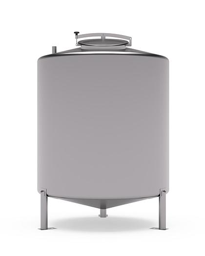 New 25.000 litre tank, Stock number: T25B4-1, Litre: 25.000, Material: Stainless steel AISI 304, Item: Tank, Standing: 4 pcs. legs, Top: Conical 15°, Bottom: Conical 20°, Tank cover: In the top, Ø 500 mm., Pipes: Top Ø 1½ og Ø 4 - Bund Ø 2½, Inner diameter: Ø 2600 mm., Cylinder: H 4500 mm., Total height: H 5627 mm., Plate type: The tank is made of pickled type B2, Inner finish: All weldings grinded grain 60, Outer finish: All weldings sandblasted, Working temperature: 0 - +50° C, Density: 1,0, Working pressure: None, Manufacturer: Handing
