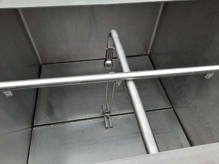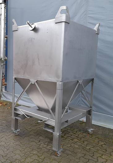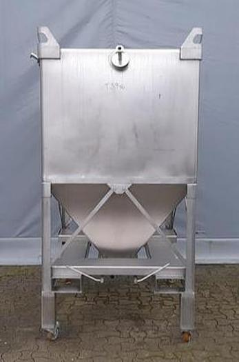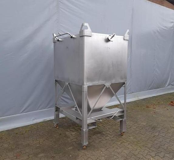 1.750 litre, Stock number: T3946, Litre: 1.750 , Material: Stainless steel AISI 304, In stock: Yes, Amount in stock: 1 pc., Item: Transportation tank, Standing: 4 pcs. legs with wheels, Top: Plain, Bottom: Conical, Double jacket: No, Insulated: No, Tank cover: In the top 820 x 1020 mm., Agitator: No, CIP: Yes, Dimensions: L 1300 x W 1020 x H 1900 mm., Total height: 2300 mm., Other: With hinged filter frame