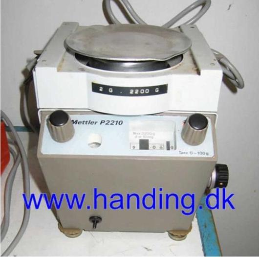 Stock number: F526, Lab. scale, Mettler type P2210., Max. 2200 g., Interval 10 mg., Tara 0 - 100 g., Stainless weighing plate Ø 130 mm., Weighing area: 0-2200 g., Interval: 10 mg.