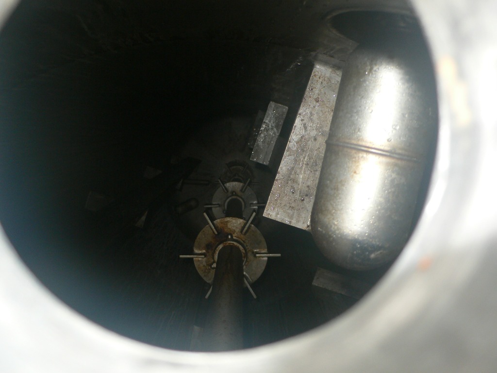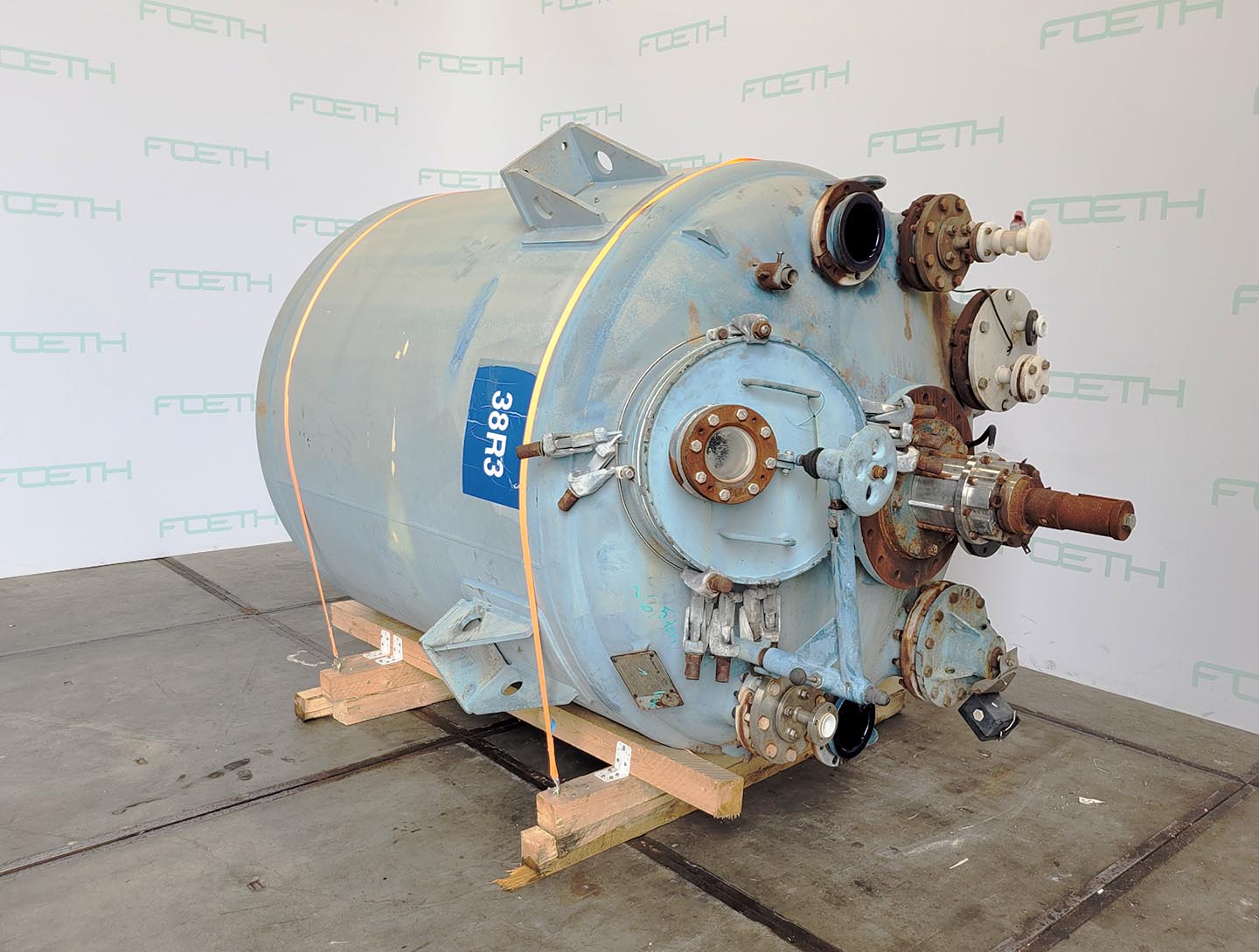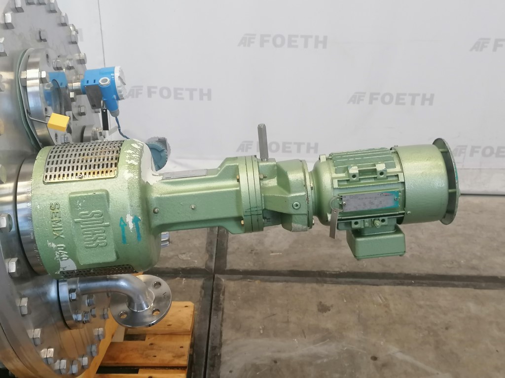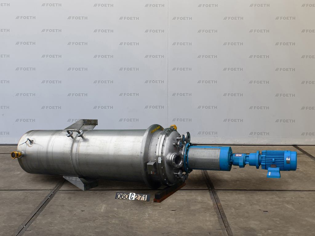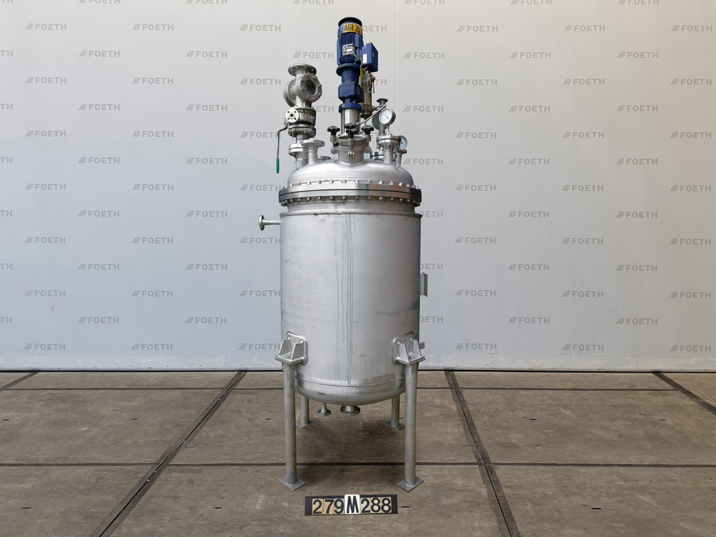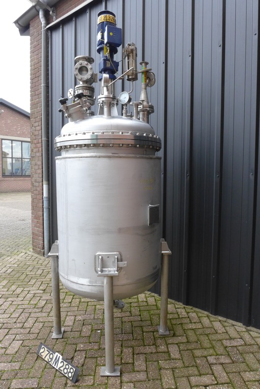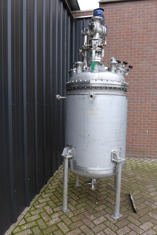 General SKU060C271 MakeHoeksma & Velt Leeuwarden No.907-407 Year of construction1989 LocationBarneveld Pressure Working pressure0.5 Bar Vacuum possiblecheck Working pressure jacket4 Bar Main Features MaterialStainless steel Volume1400 Ltr. Motor4 KW Specified Features - Stainless Steel Reactor Reactor(1x) Capacity1400 Ltr Vessel sizesdia. 800x2750mm Dished bottomcheck Dished top sidecheck Top connections6x dia. 25mm + dia. 80mm Outletdia. 25mm With jacketcheck Max. temperature120 Degr. C. With propellor stirrer(3x Turbine stirrer on one shaft) Motor4,0 KW, 380/660 Volt (Ex) Stainless Steel Reactors MaterialStainless steel 1.4401 (316) Information Floorspace1,2x1,2 M Total height5,0 M Weight1100 KG ATEX compatiblecheckPaints & coatingsGeneric medicinesOintmentsFine chemicalsOther chemicalStainless Steel ReactorsRubberAgrochemicalsPlastic & polymersCatalyst ...