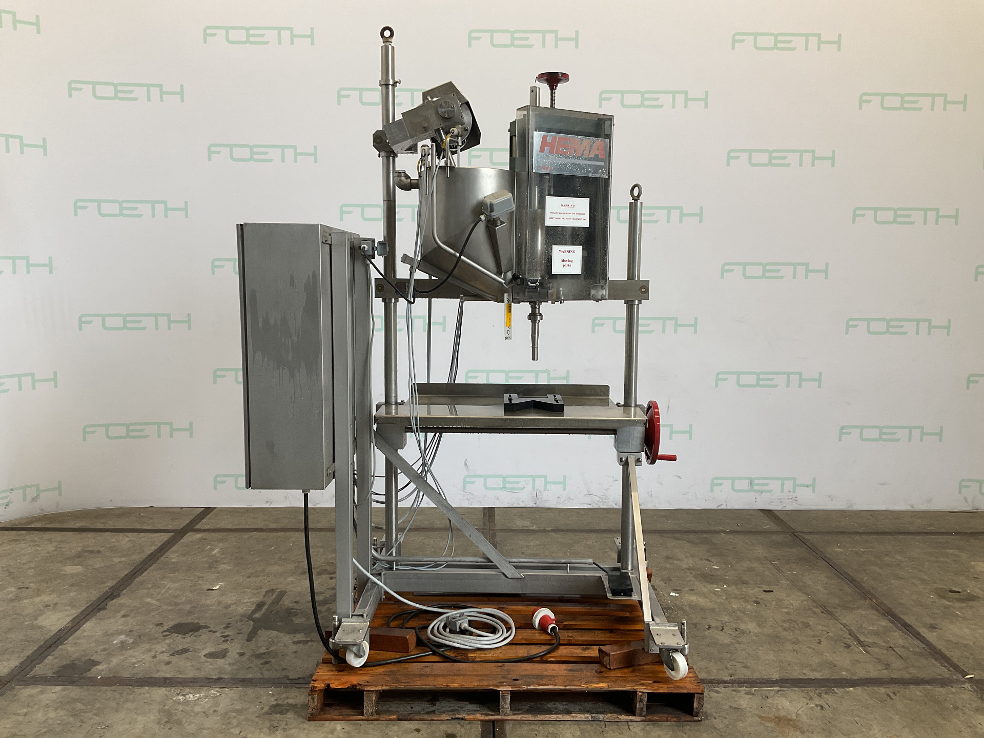 General SKU108Y770 Year of construction1996 LocationBarneveld Main Features MaterialStainless steel Number of1 heads Dosing1000 ml Specified Features - Piston filler MaterialStainless steel Piston filler(1x) Dosingmax. ± 1000 Ml Number of pistons:1 (dia. 95x200mm) Number of filling heads:1 With hopperequipped with stirrer and electric heating Mounted on framecheck With switchgearcheck Mounted on wheelscheck Floorspace1,8x1,3 M Total height2,6 MPiston fillersDiscountHema (Sidel)Packaging machines > Piston fillersDiscountBrand > Hema (Sidel) What you can expect from Foeth: -- Machine is in working condition -- At a reduced price compared to new -- Ready for shipping to any destination worldwide -- You are welcome to inspect the machine in Barneveld, The Netherlands. Please visit us in Barneveld for many more machines!