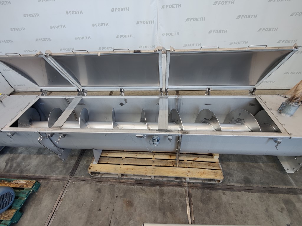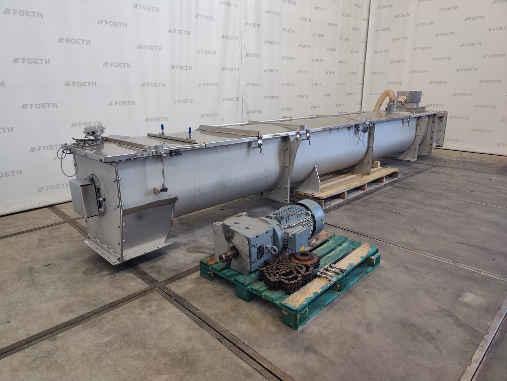General SKU239T286 LocationBarneveld CEcheck Main Features Motor18.5 KW Length5000 mm Inlet diameter390 mm Specified Features - Horizontal screw conveyor MaterialStainless steel Horizontal conveyor screwcheck Trough-typecheck Diameter700 mm Length5000 mm Shaft diameterdia. 200 mm Pitch500 mm Inletdia. 390 mm Outlet650x400 mm Motor18,5 kW Screw speed33 rpm Height between in- and outlet1500 mm With coverscheck Information MakeGuttridge Mach.No.0580194-7-1 Year of construction2013 Floorspace7,3x1,7 m Total height1,40 m Weight3000 kg Extra SpecificationsSynatel level control, type digimatic, Schmersal sensors Technical specs Extra informationScrew blade thickness 6 mmOils & fatConsumer wastePaints & coatingsPowdered foodsHorizontal screw conveyorsGeneric medicinesOintmentsTea, herbs & coffeeFine chemicalsStarchOther chemicalRubberBiotechnologyAgrochemicalsSpic ...