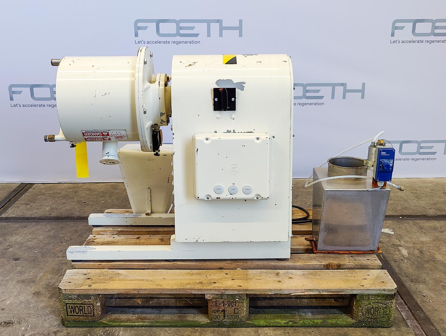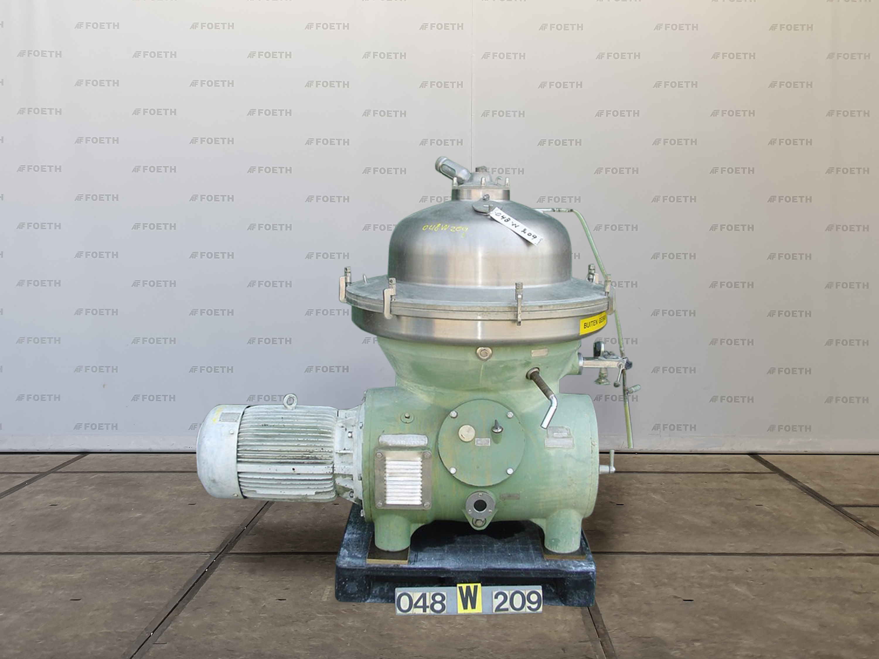 General SKU048W209 MakeWestfalia TypeSAK-20036 No.1643130 Year of constructionunknown LocationBarneveld Main Features MaterialStainless steel Motor30 KW Specified Features - Separator MaterialStainless steel Separator(1x) Motor30,0 KW, 380 Volt Max. rotor speed4500 Rpm Information Floorspace1,8x1,5 M Total height1,5 M Weight2000 KGSeparatorsDiscountWestfaliaCentrifuges > SeparatorsDiscountBrand > Westfalia What you can expect from Foeth: -- Machine is in working condition -- At a reduced price compared to new -- Ready for shipping to any destination worldwide -- You are welcome to inspect the machine in Barneveld, The Netherlands. Please visit us in Barneveld for many more machines!
