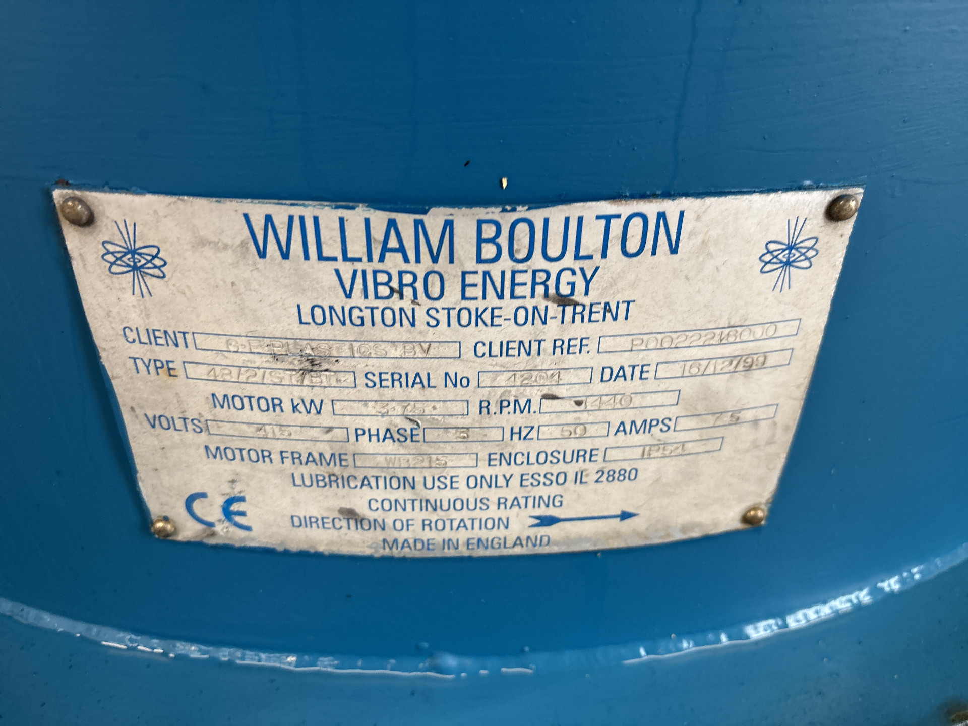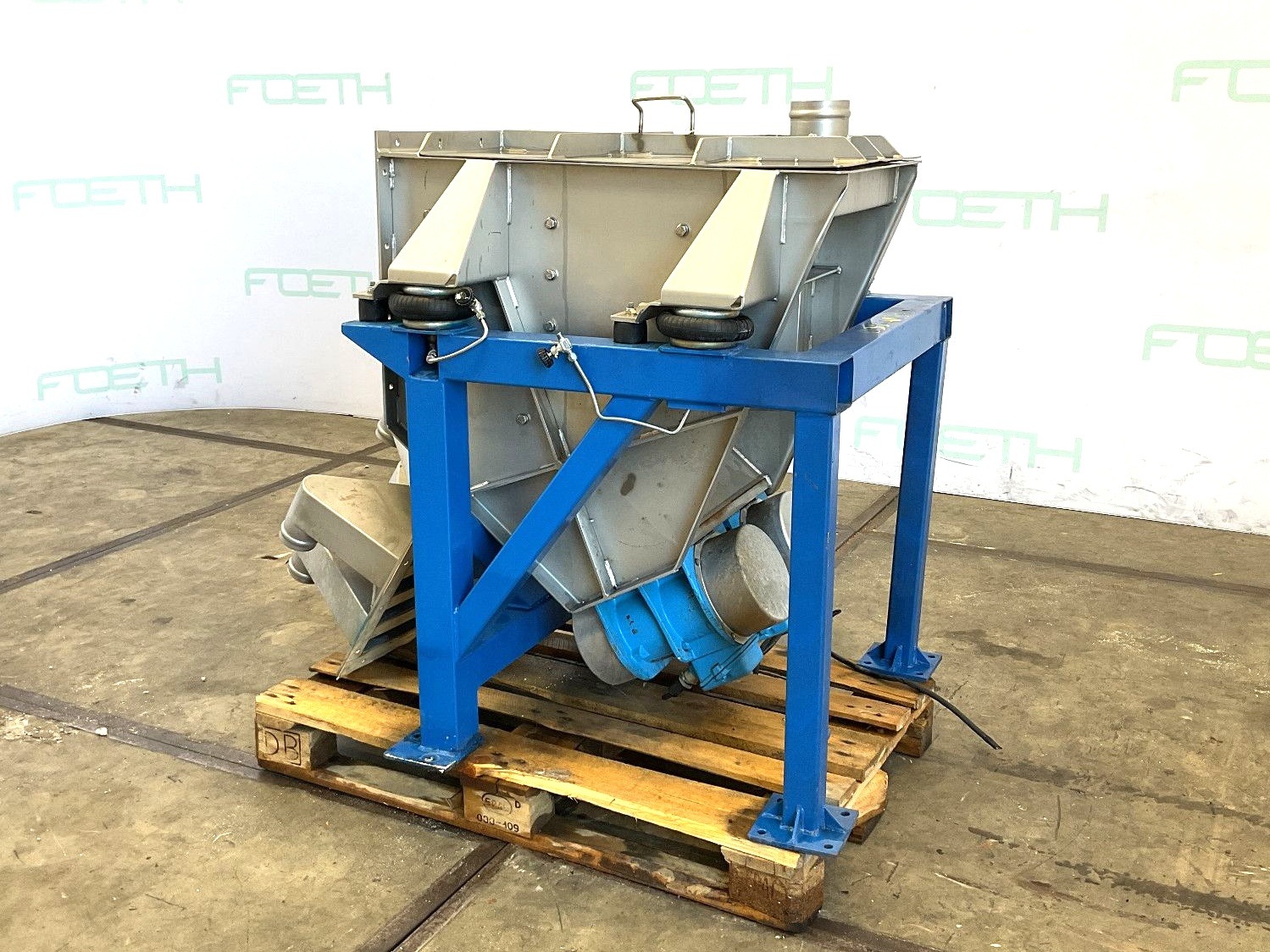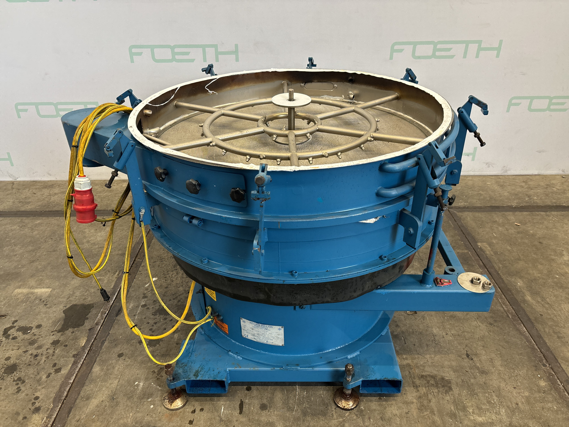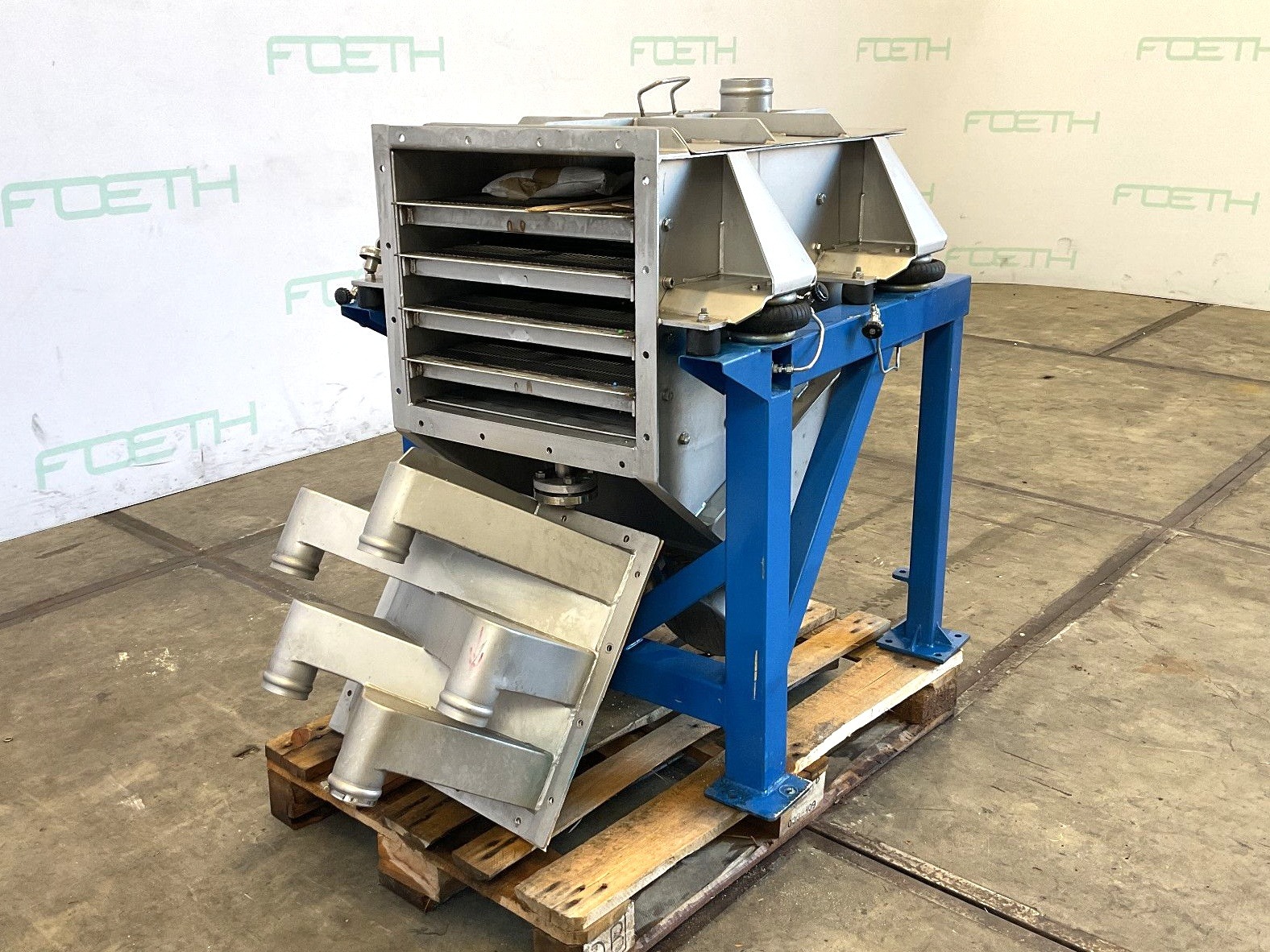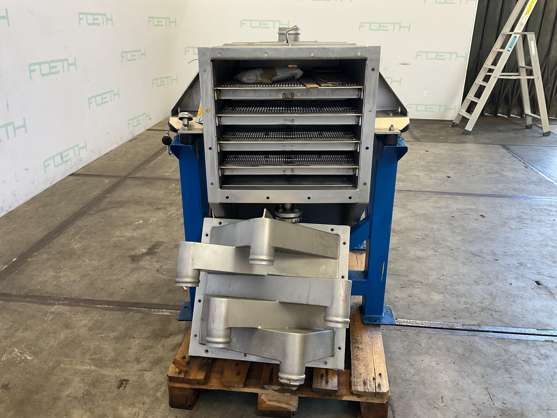 General SKU051U324 LocationBarneveld MakeWilliam Boulton TypeModel 48/2/ST/BT- MKII No.4204 Main Features MaterialStainless steel Surface1 m2 Sizes diameter1150 mm Specified Features - Vibro sieve MaterialStainless steel 1.4301 (304) Vibro sieveVibro-Energy separator (1x) Sieve surface1,0 m2 Number of sieve decks:2 Sieve sizesdia. 1150 mm Outlet2x dia. 145mm + 1x dia. 195mm Motor3,75 kW (400 V, 1440 rpm) Sieve perforationdeck 1= 5,5 mm, deck 2= 1,96mm With ball cleaning(lower deck) Information Year of construction1999 Floor space1,3 x 1,2 m Total height1,2m Weight730 kg Extra Specifications- Upper deck perforated screen plate, lower deck woven wire mesh with anti- blinding ball tray. Integral air & water spray system Consumer wastePowdered foodsGeneric medicinesStarchOther chemicalRubberPlastic & polymersFeed additivesPaper & otherDiscountOther pharmaceuticsOrga ...
