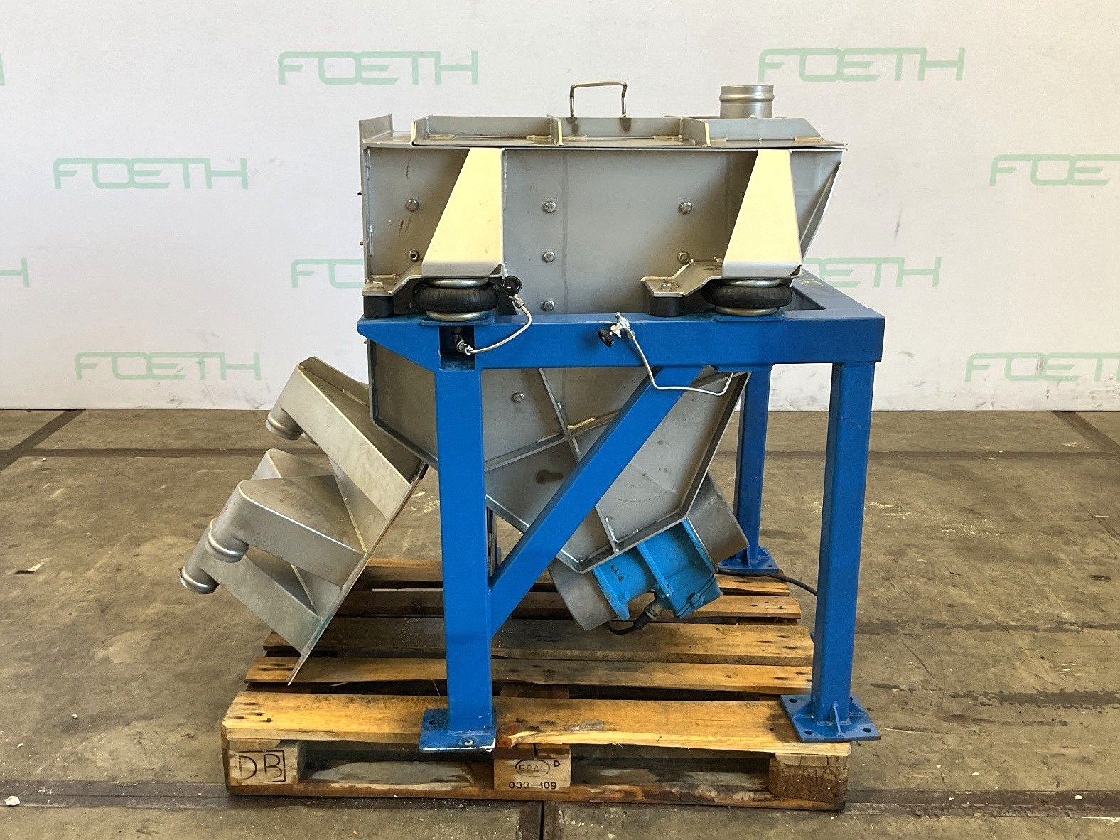 General SKU032U183 MakeSuperior B.V. TypeSZV 800/5/6 No.8671 Year of construction1991 LocationBarneveld Main Features MaterialStainless steel Surface0.3 m2 Size length580 mm Sizes width480 mm Specified Features - Vibro sieve Vibro sievecheck Sorting and dewatering sieve Sieve surface0,28 m² Number of sieve decks:4 Sieve sizes580 x 480mm With covercheck Inletø 100mm Outlet5x ø 75 mm + water outlet Drive vibro motorcheck Motor2x 0,4 kW, 220/380 V, 980 rpm Sieve perforation7,0mm, 6,0mm, 5,0 mm, 4,0 mm MaterialStainless steel Information Mounted on mild steel framecheck Floor space1,3x1,0 m Total height1,2 m Weight400 KGConsumer wastePowdered foodsGeneric medicinesStarchOther chemicalRubberPlastic & polymersFeed additivesPaper & otherOther pharmaceuticsOrganicsE-waste & metalSugarAnimal feedOther feedSolid pharmaceuticsPlastic & rubberVibro sievesMinerals & in ...