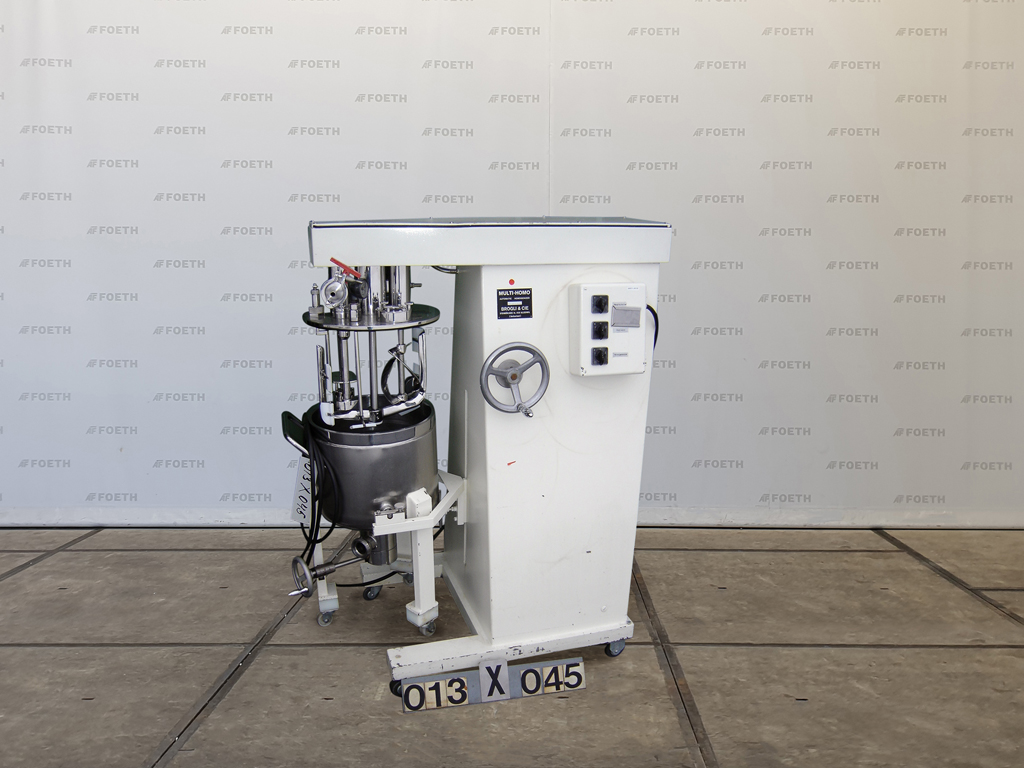 General SKU013X045 MakeBrogli TypeMH-20C No.1536 Year of construction1973 LocationBarneveld Pressure Working pressure0 Bar Vacuum possiblecheck Working pressure jacket1 Bar Main Features MaterialStainless steel Volume25 Ltr. Specified Features - Processing vessel Closed stirring vesselVacuum processing vessel (1x) Capacity25 Ltr, Useful 20 Ltr Vessel sizesdia. 345x275mm, Vessel mounted on wheels Dished bottomcheck Flat top sidecheck With jacketcheck With propellor stirrer(spiral Helix stirrer) With anchor stirrerscraper stirrer Motor± 0,18/0,24 KW Speed mixing shaftAnchor 30,5/61, Helix 61/122 Rpm With homogeniser(1500/3000 Rpm) Motor± 0,25/0,37 KW MaterialStainless steel 1.4301 (304) Information With switchcheck Floorspace1,2x0,7 M Total height1,4 M Technical specs Extra informationVessel mounted on wheels Processing vesselsDiscountBrogliProcessing ve ...