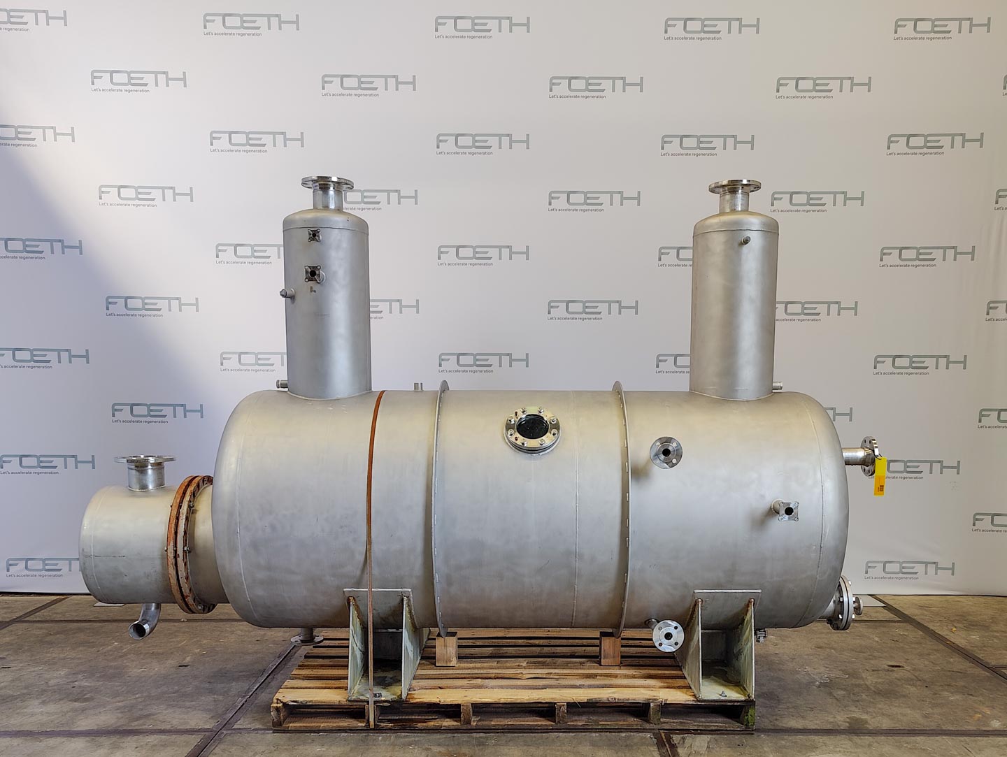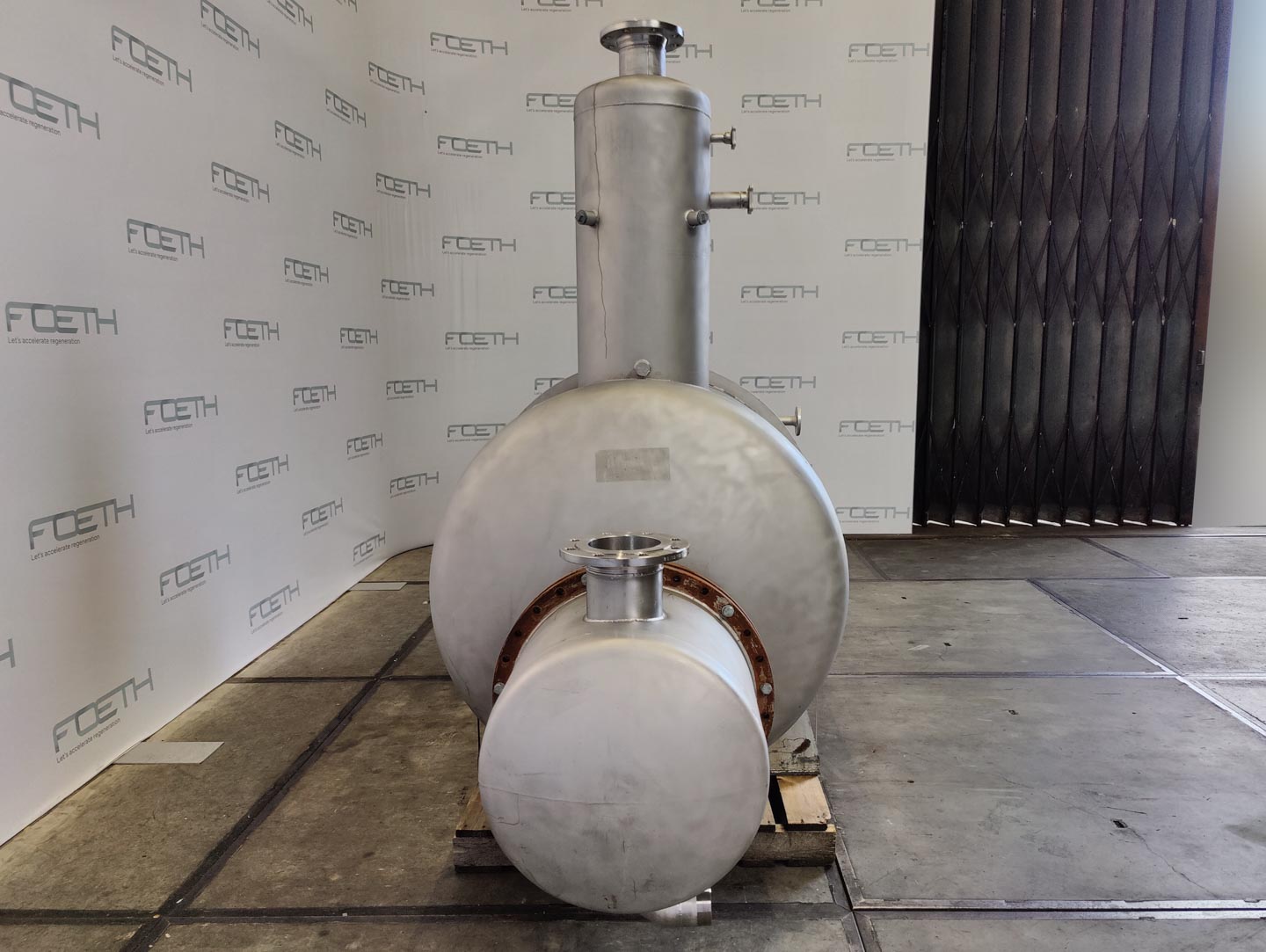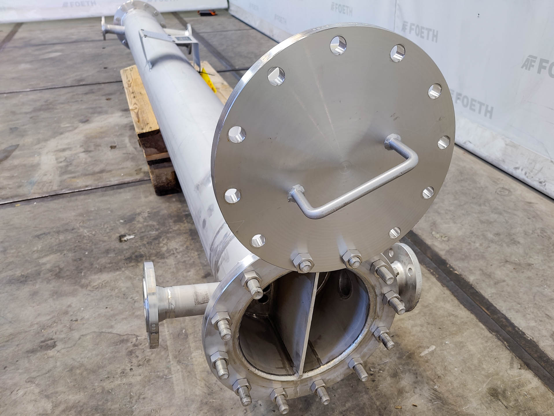 General SKU212T550 MakeKuehni LocationBarneveld Pressure Vacuum possiblecheck Vacuum possible jacketcheck Working pressure shell1 Bar Vacuum possible shellcheck Working pressure tubes6 Bar Tubular vacuum possiblecheck Main Features Shell (Material)Stainless steel Tube (Material)Stainless steel Surface6.3 m2 Specified Features - Shell and tube heat exchanger MaterialStainless steel 1.4571 (316Ti) Heat exchangercheck Horizontalcheck Heating surface6.3 m² Tube capacity17,5 Ltr. Number of tubes:1 Tube diameter30 mm Tube length± 13,1 m Wall thickness tubes2 mm Shell capacity41 Ltr. Shell diameter190 mm Shell length2490 mm Wall thickness shell2,6 mm Max. temperature200 °C Shell connectionsDN 25 (2x), DN 15 Cover connectionsDN 80, DN 40 Information No.227480 Year of construction1990 Floorspace2,6x0,55 m Total height0,35 m Weight160 kgOils & fatConsumer w ...