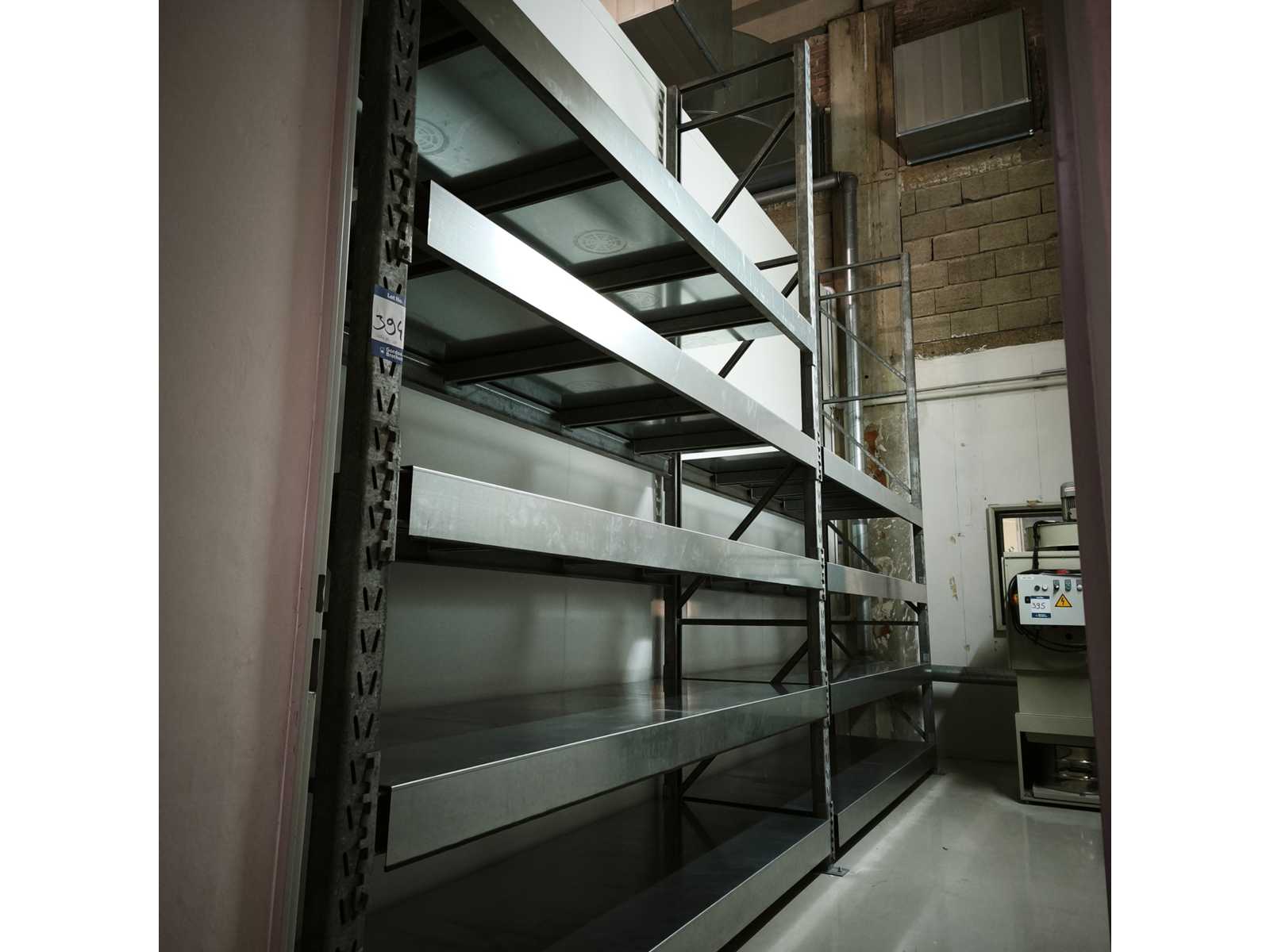 1x Heavy-duty shelving with steel sheet shelves, dimensions LxWxH in cm 560x84x400, contents 3x uprights / 18x crossbeams / each level with detachable intermediate crossbeams, 9x steel sheet shelves Auction-ID: A1-45187-394