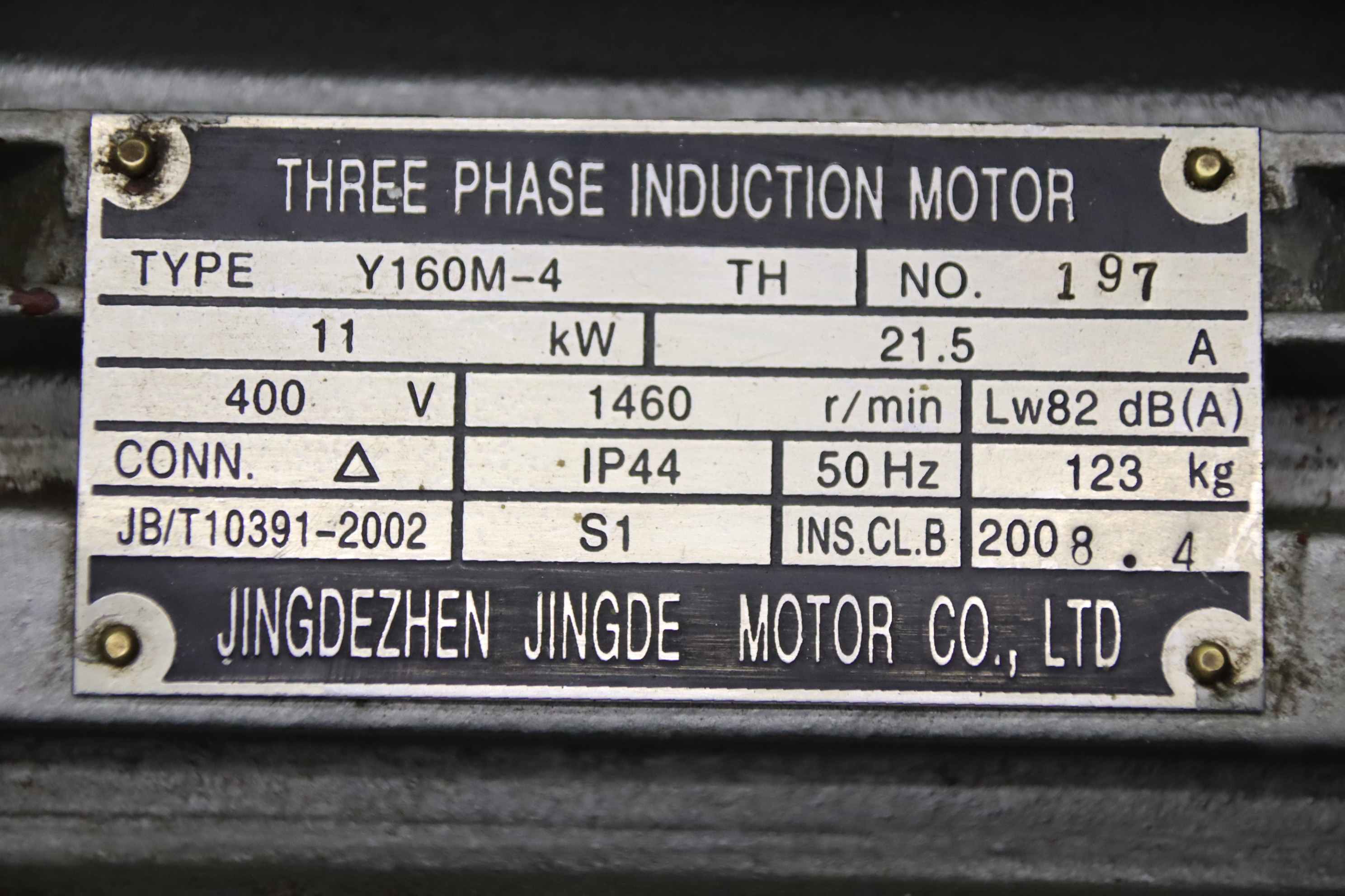 Three-phase motor, electric motor -Manufacturer: Jingdezhen, Electric motor type Y160M-4 -Power: 11 kW -Speed: 1460 rpm -Voltage: 400 V -Shaft: Ø 42 x 110 mm -Design: B3 -Protection rating: IP44 -Dimensions: 600/390/H315 mm -Weight: 107 kg