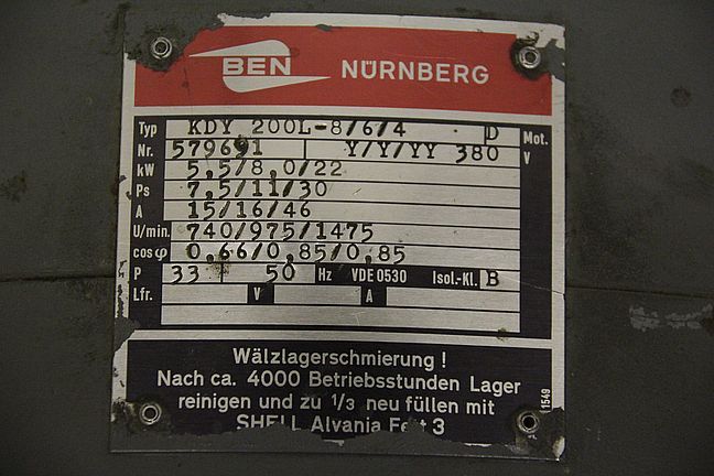 Three-phase motor with 2 speeds, electric motor-Power: 3/5.2 kW-Speed: 720/1450 rpm-Shaft: Ø 32 mm-Construction: B3-pole changing-Protection class: --Price: per piece-Number: 1x available-Dimensions: 510/370/H300 mm-Weight: 92 kg
