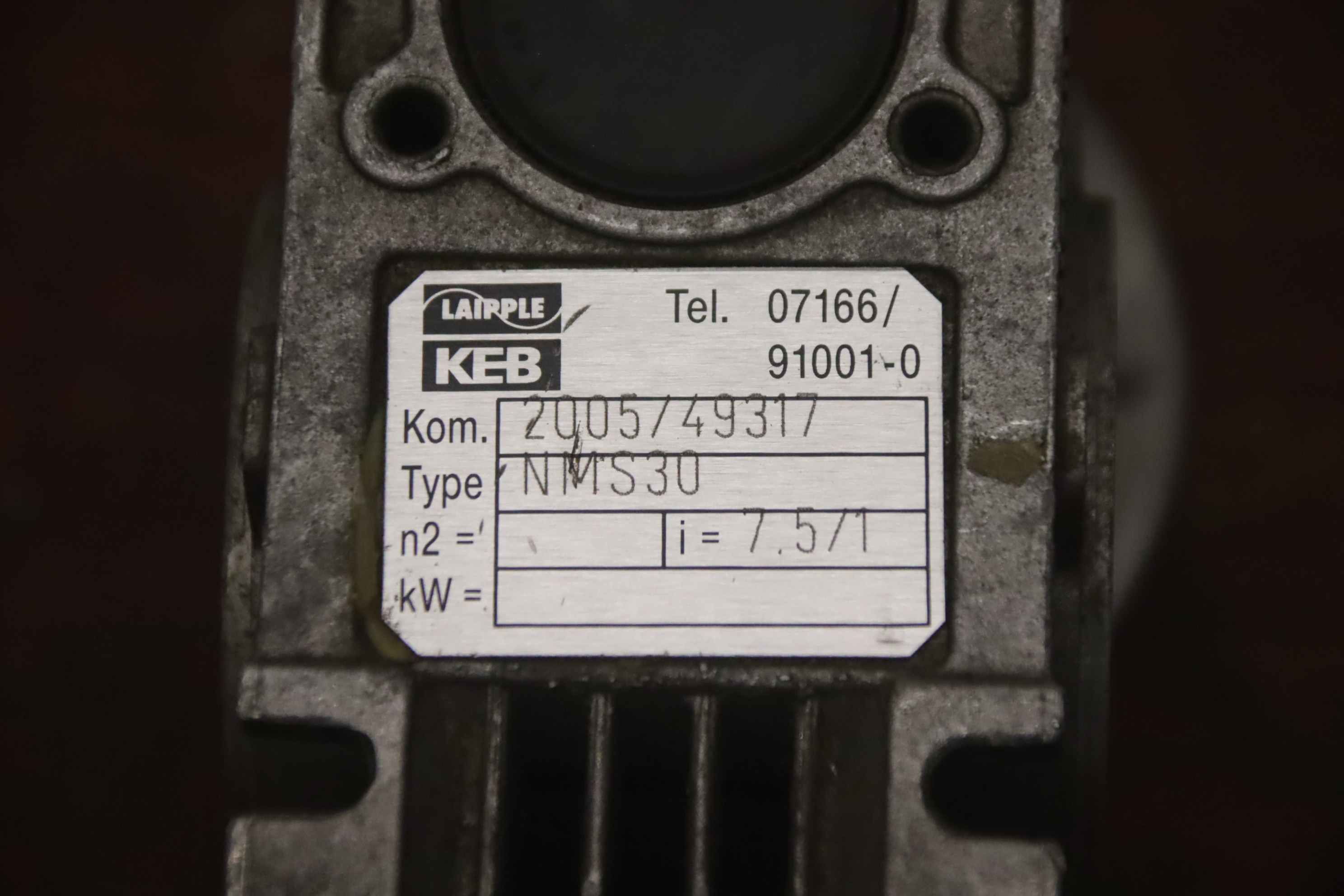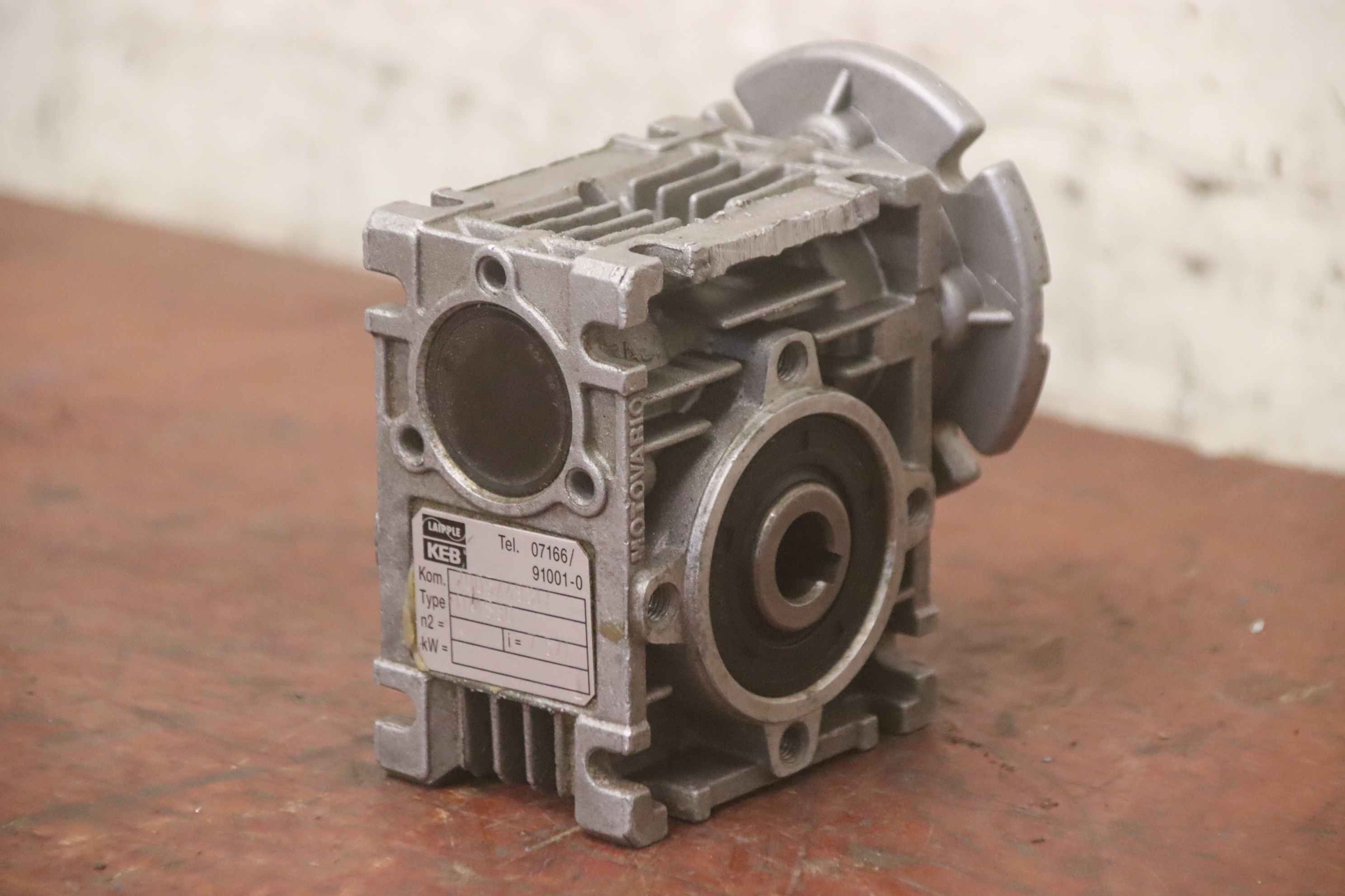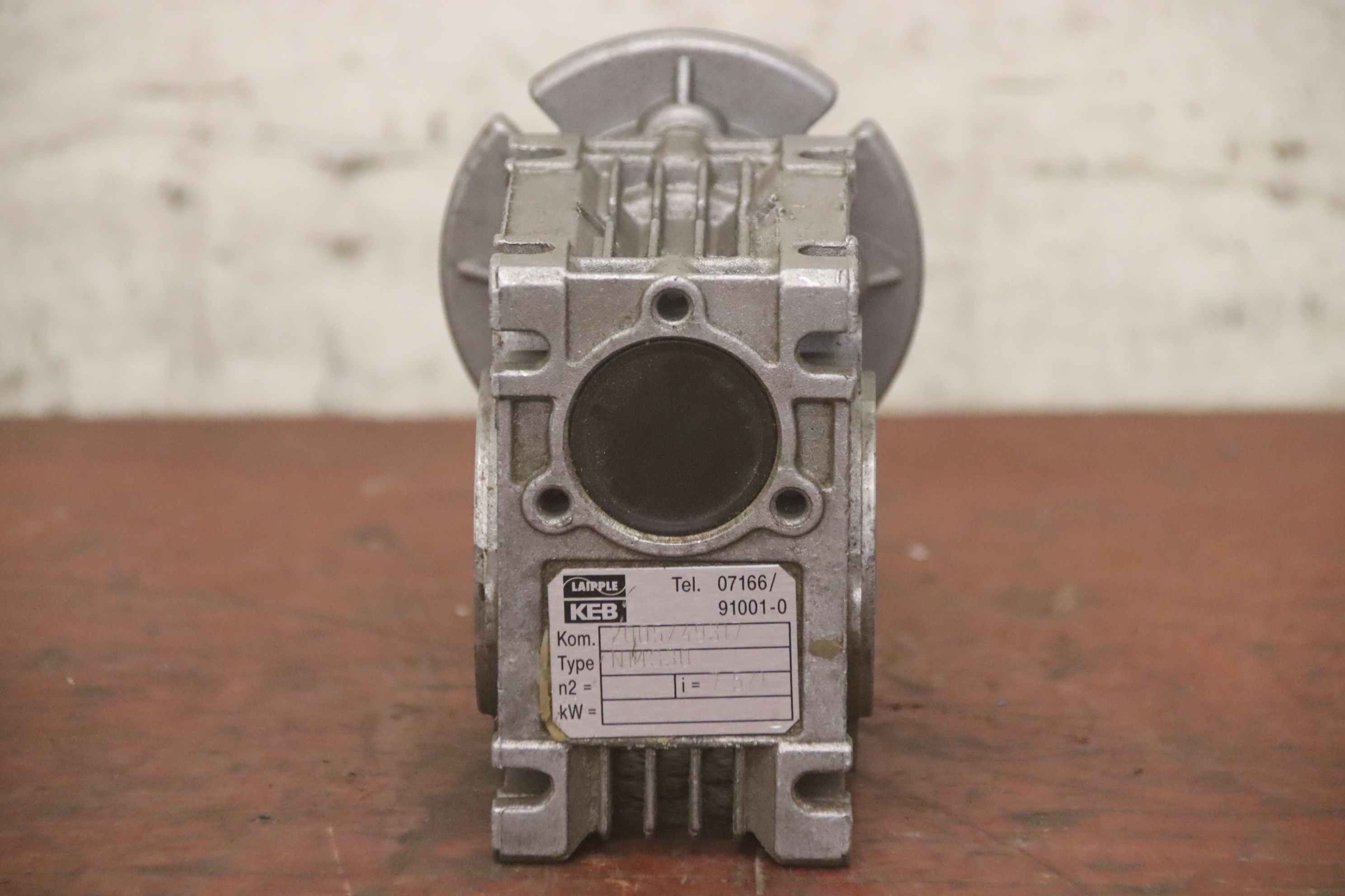 Gearbox, spur gear, angle gear, worm gear-Manufacturer:Laipple / KEB, worm gear type NMS30-Translation: i= 7.5/1-Hollow shafts: Ø 9 x 22 mm / Ø 14 x 63 mm-Dimensions: 96/80/H110mm-Weight: 1.1 kg