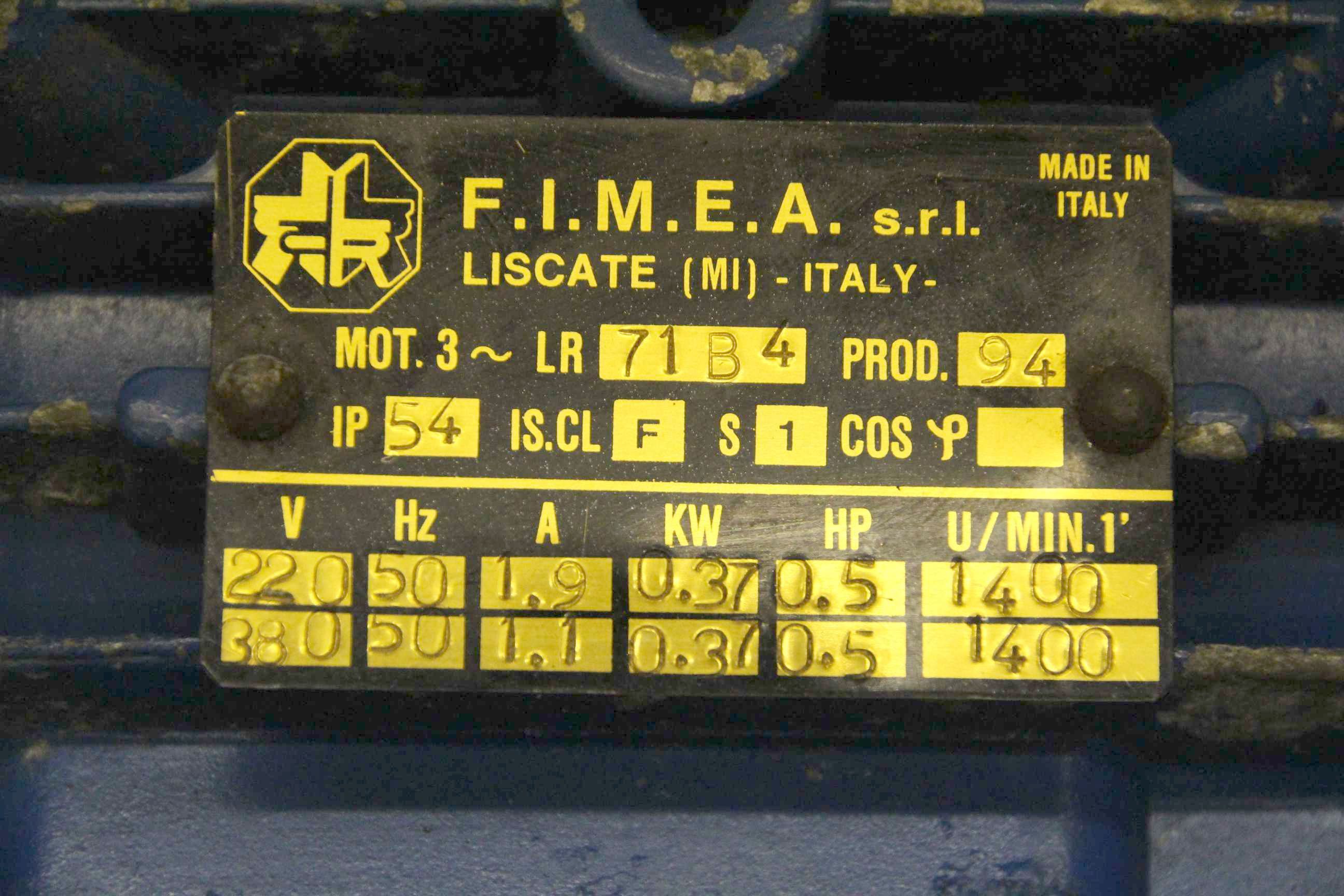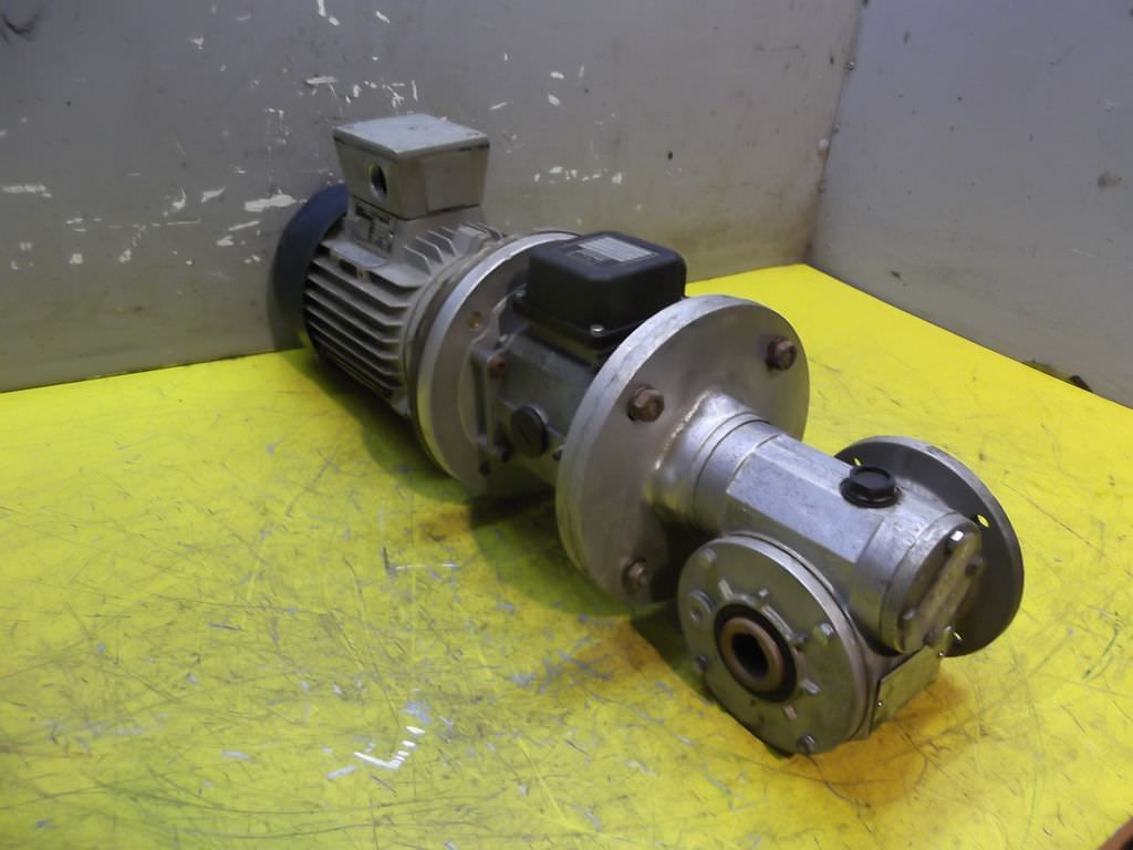 Gear motor, electric motor, electric gear motor-Motor: FIMEA type LR 71 b4-Gearbox: 21 rpm, with oil level indicator-Power: 0.37 kW-Voltage: 220/380 volts-Hollow shaft: Ø 24 x 100 mm-Protection class: IP54-Brake: 380 v-Dimensions: 470/160 / H195 mm-Weight: 19 kg
