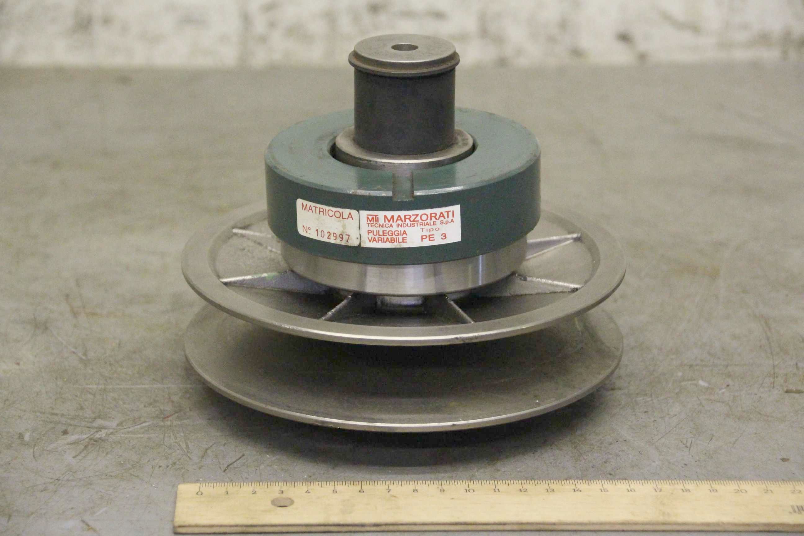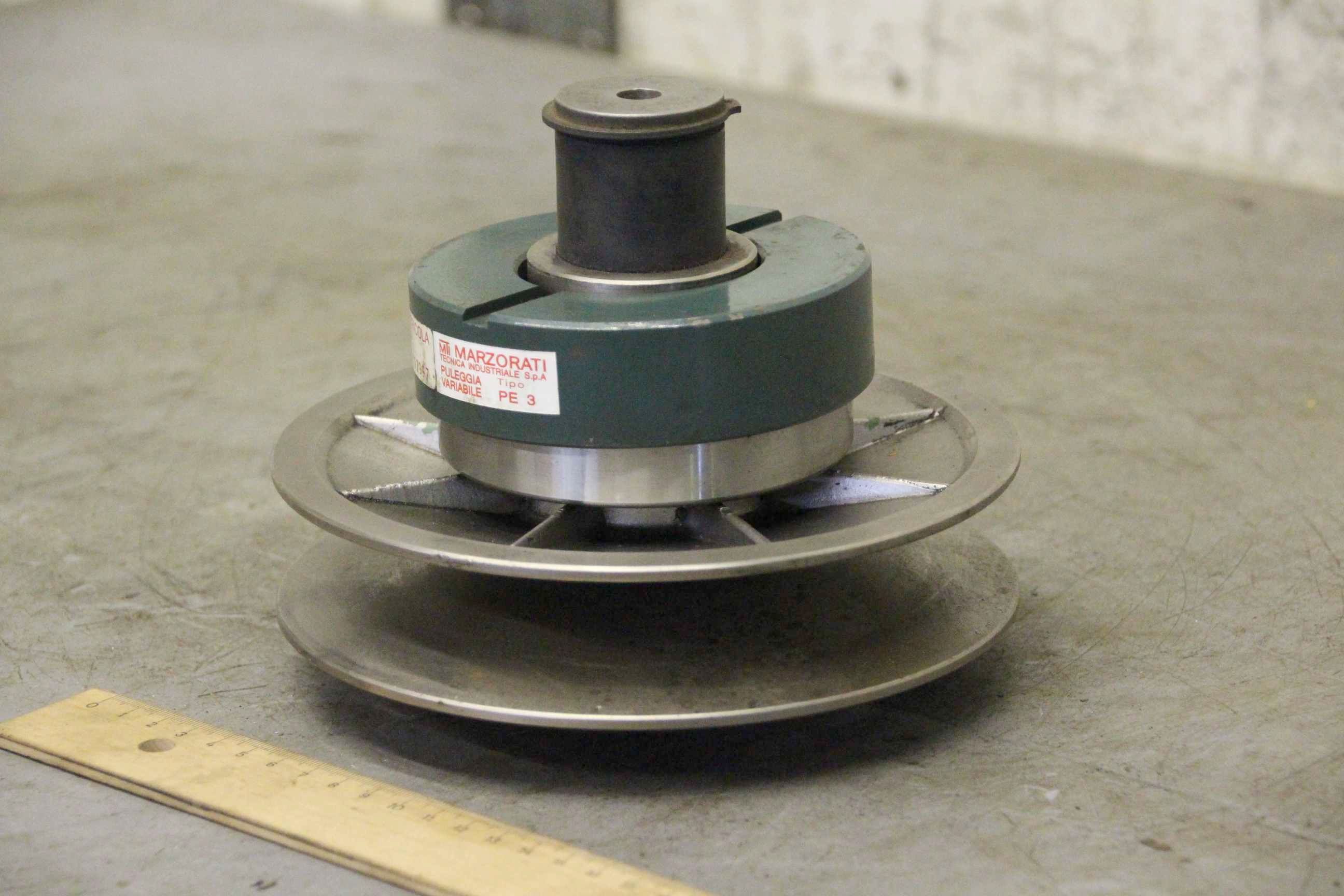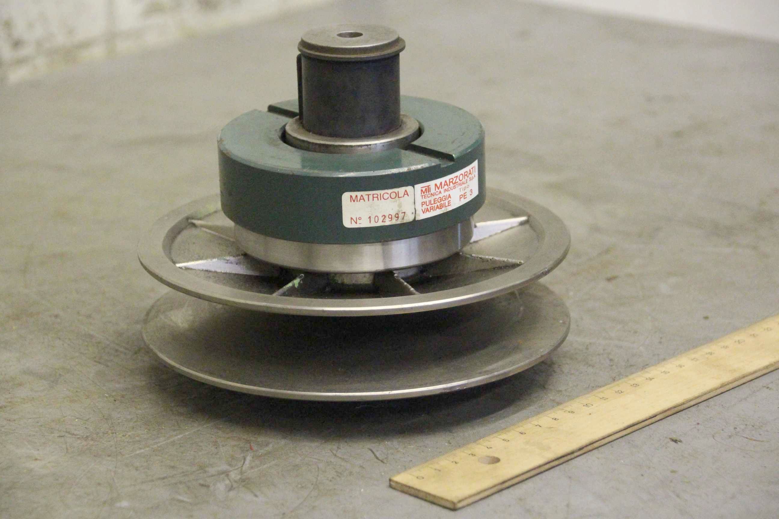 Variator pulley, vario timing pulley, vario pulley, PIV gearbox, vario gearbox, variable speed pulley, variable pulley, expansion pulley, adjustable V-pulley-Manufacturer: Marzorati, Vario pulley with thrust bearing type PE 3-Outer pulley diameter: 180 mm-Diameter inside: 28 mm-Dimensions: Ø180 x 145 mm-Weight: 3.2kg
