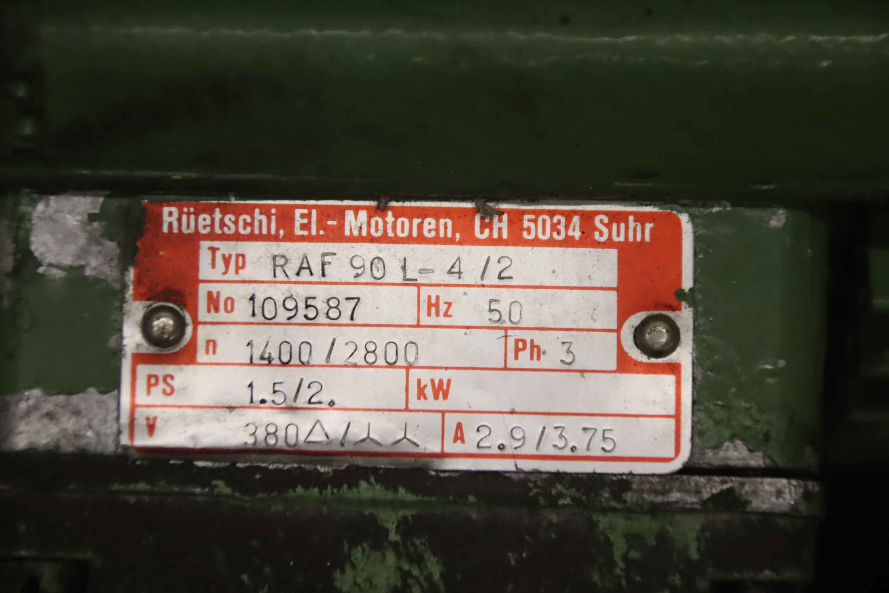 electric motor, three-phase motor-Manufacturer: Rüetschi, electric motor type RAF 90 L-4/2-Power: 1.5/2 kW-Speed: 1400/2800 rpm-Shaft: Ø 22 x 40 mm-Design: B5-Dimensions: 325/215/H180 mm-Weight: 15.3 kg