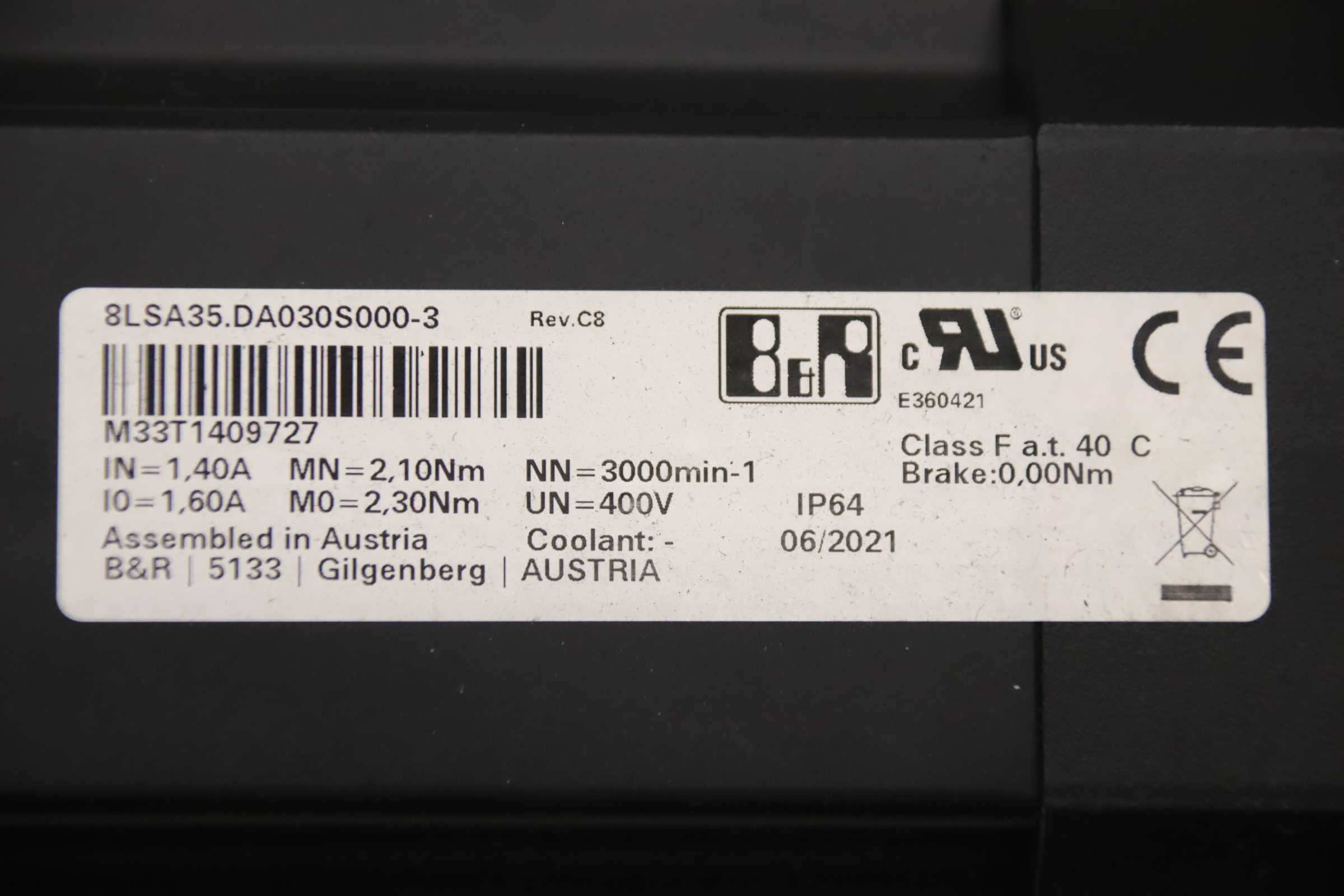 Servo motor, electric motor, DC motor, servo geared motor, synchronous motor-Manufacturer: B&R, Servo geared motor 8GP40-LSA35-00244-Motor: Type 8LSA35.DAA030S000-3-Voltage: 400 V-Speed: 3000 rpm-Gearbox: 8GP40-080- -008S2L3 i=008-Shaft: Ø 20 x 35 mm-Dimensions: 308/90/H133 mm-Total weight: 5.8 kg