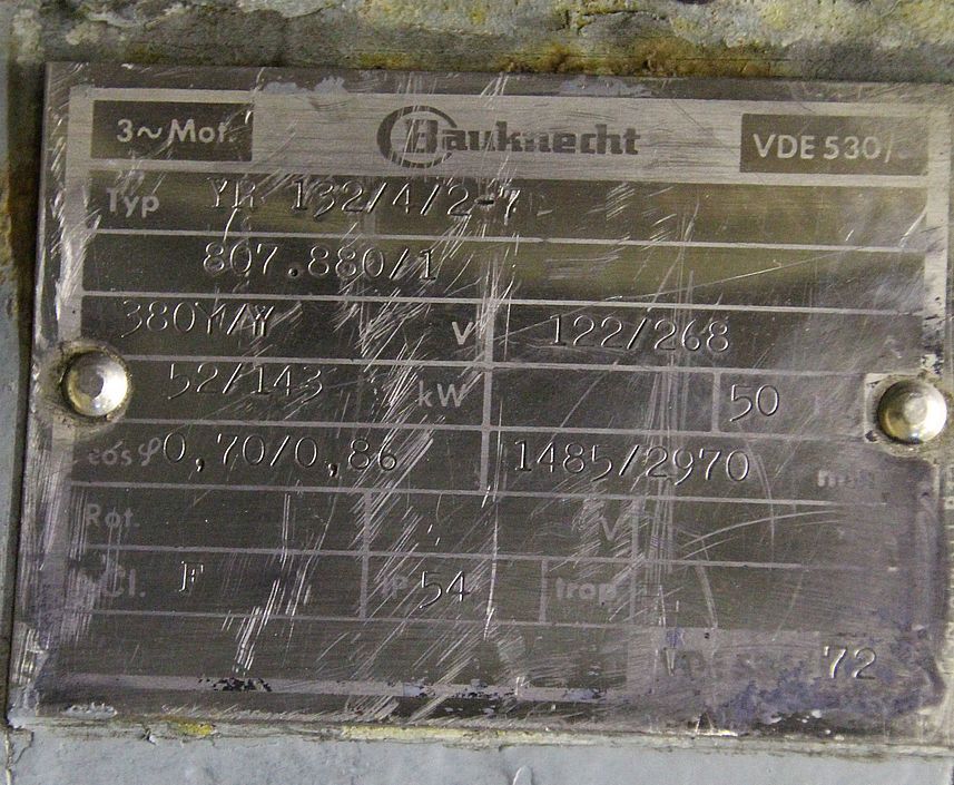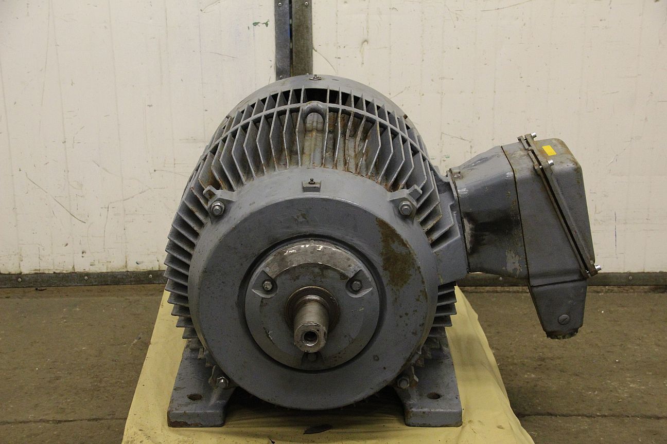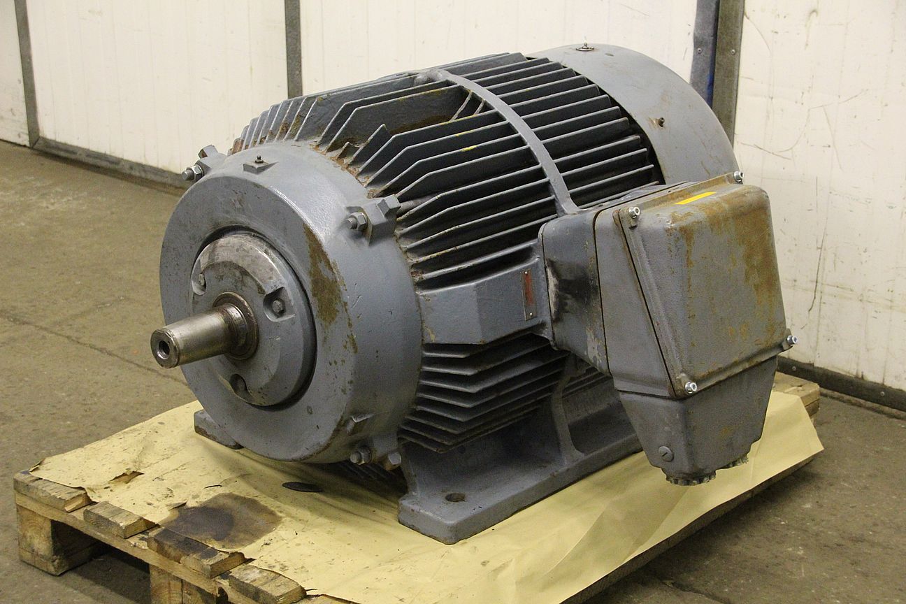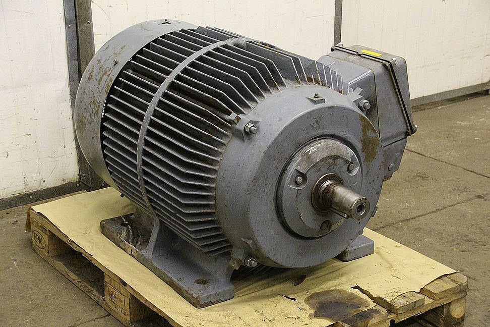 three-phase motor, electric motor -Handover: in current condition as viewed -Note: the base of the engine has been welded once -Power: 52/143 kW -Speed: 1485/2970 rpm -Shaft conical: Ø 70 to 60 mm 125 mm long -Design: B3 -Protection class: IP 54 -Dimensions: 1130/920/H630 mm -Weight: 876 kg