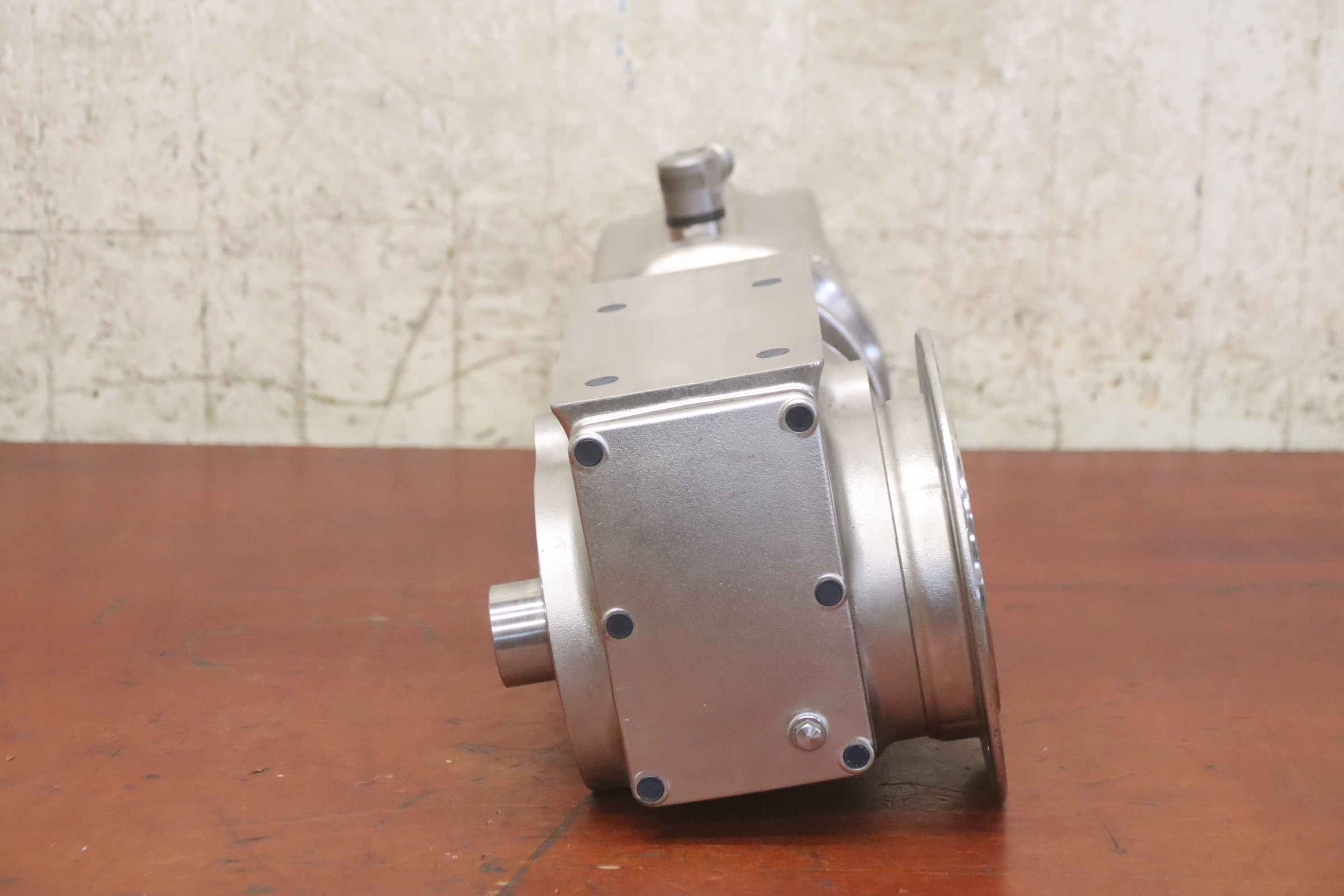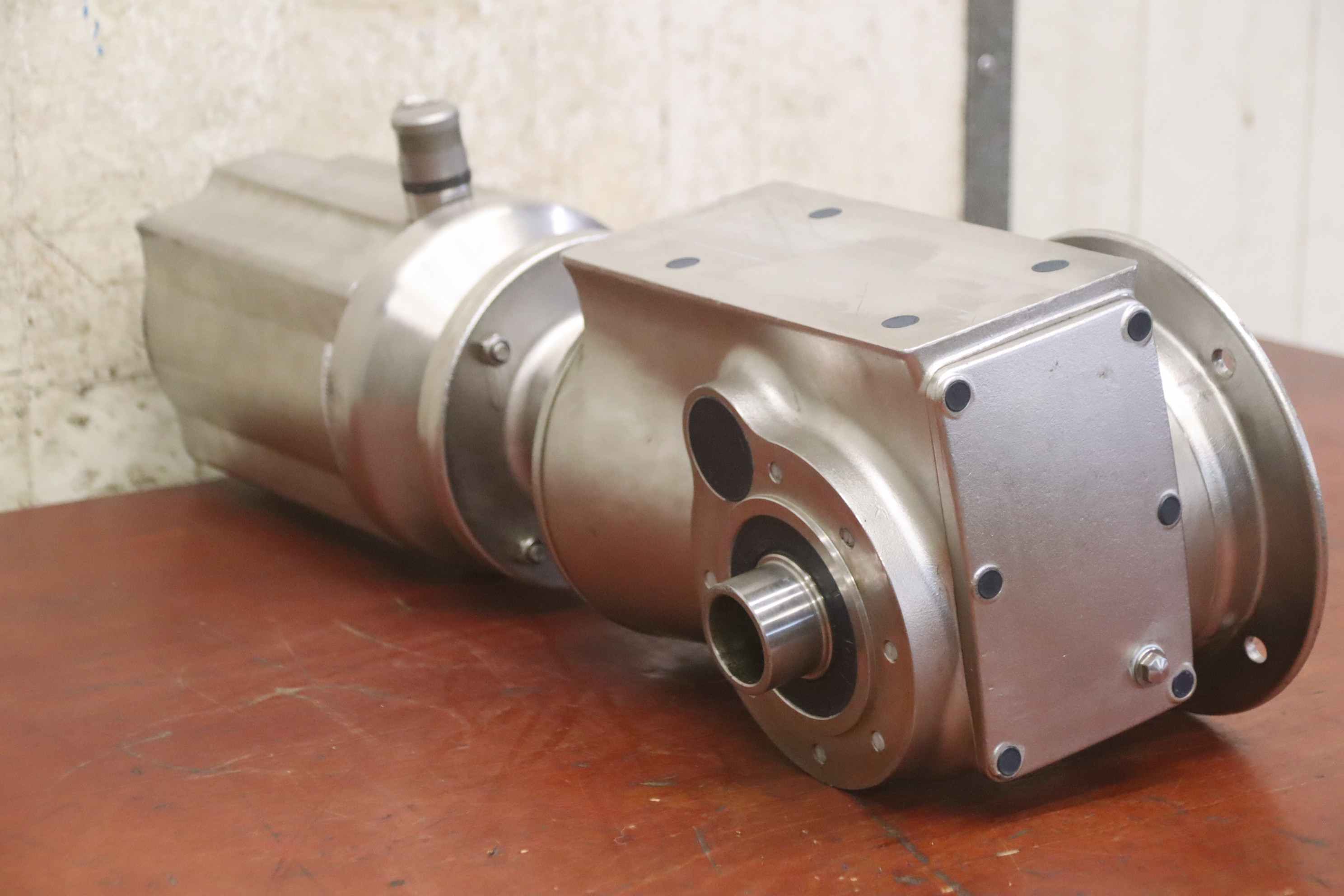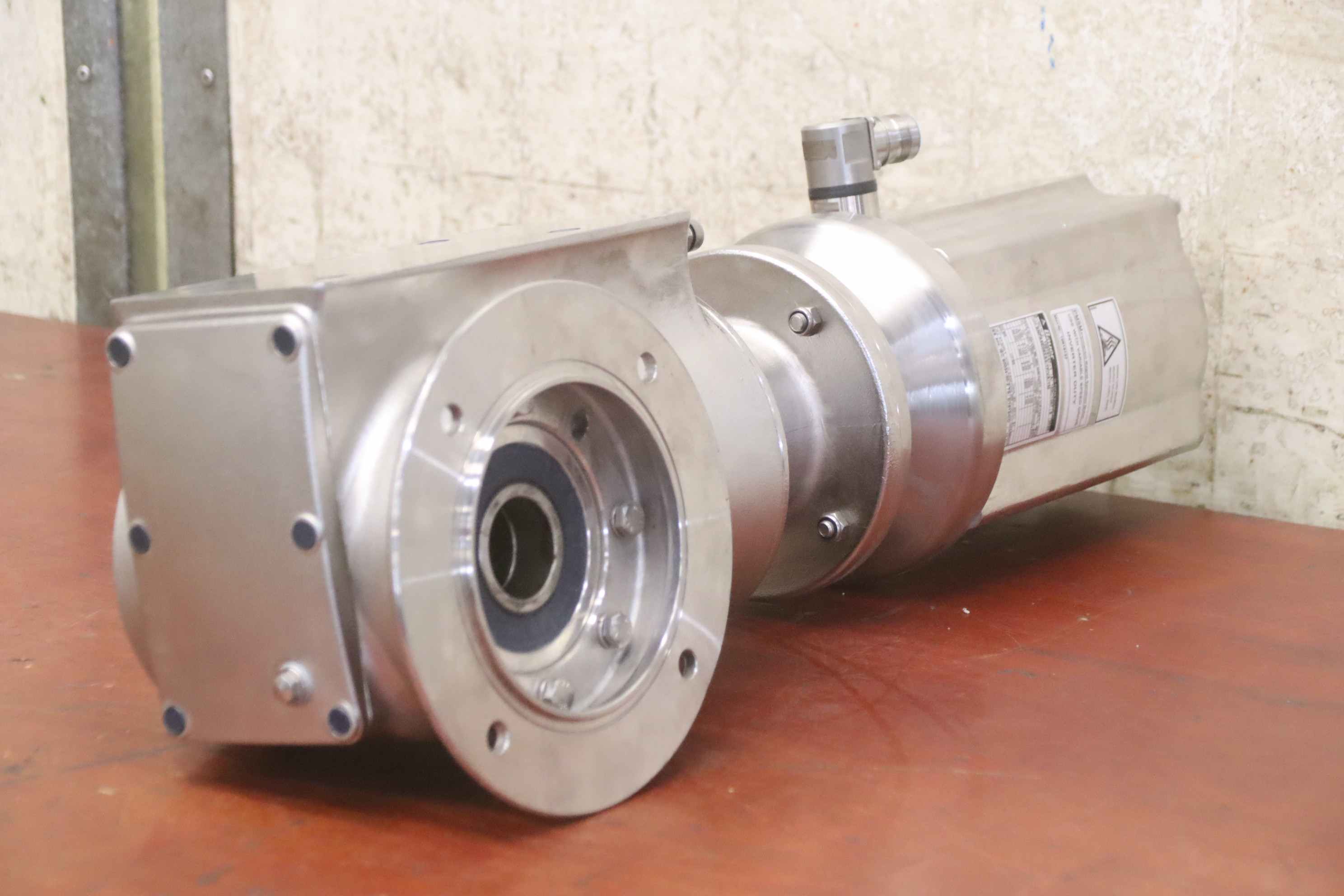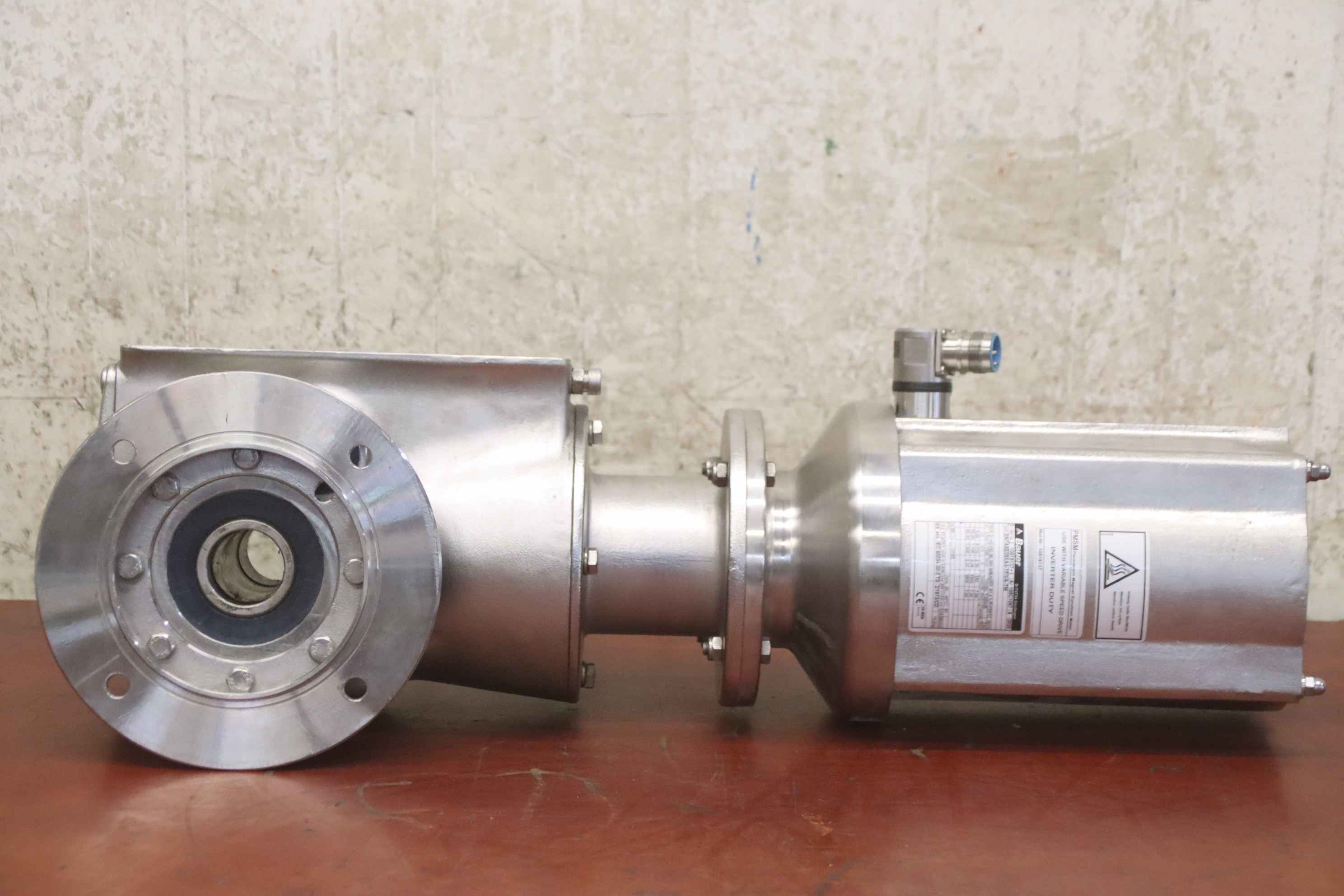 Gear motor, electric motor, electric gear motor, stainless steel motor, stainless steel gear motor, stainless steel bevel gear motor, permanent magnet synchronous motor -Manufacturer: Bauer, adjustable stainless steel gear motor -Note: Frequency converter required -Type. SNFA5E09XA4-TF/VA-TM -Engine: speed 150-1500 rpm -Power: 1.1 kW -Hollow shaft: Ø 38 x 1750 mm -Protection class: IP65 -Dimensions: 645/200/H220 mm -Weight: 53 kg