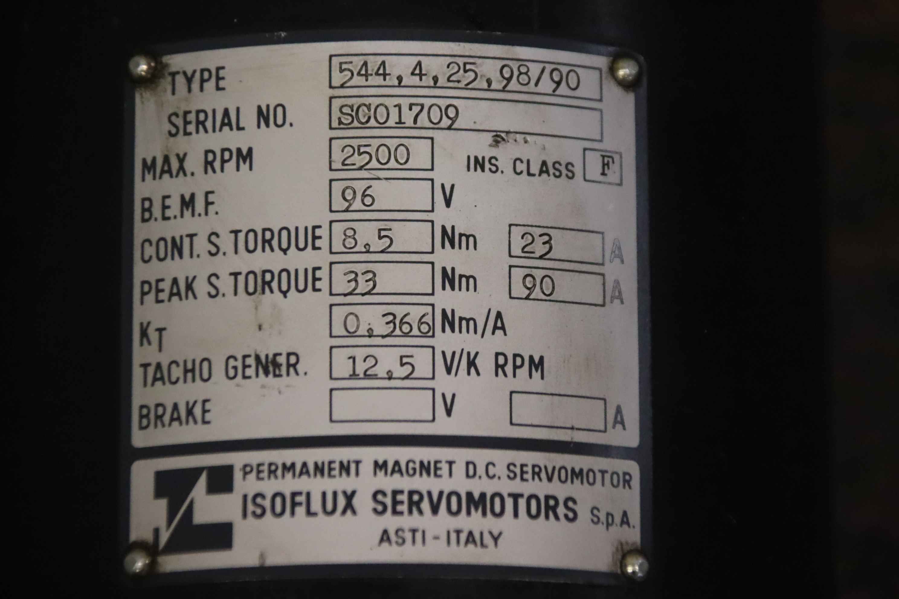 servo motor, electric motor, DC motor, stepper motor, stepping motor-Manufacturer: Isoflux, servo motor with encoder-Servo motor: Type 544,4,25,98/90-Speed: max: 2500 rpm-Voltage: 96 V-Shaft: Ø 16 x 50 mm-Bolt circle: Ø 130 x 10 mm-Protection class: F-Encoder: Heidenhain ROD 426 1000-Dimensions: 490/127/H150 mm-Weight: 14.9 kg