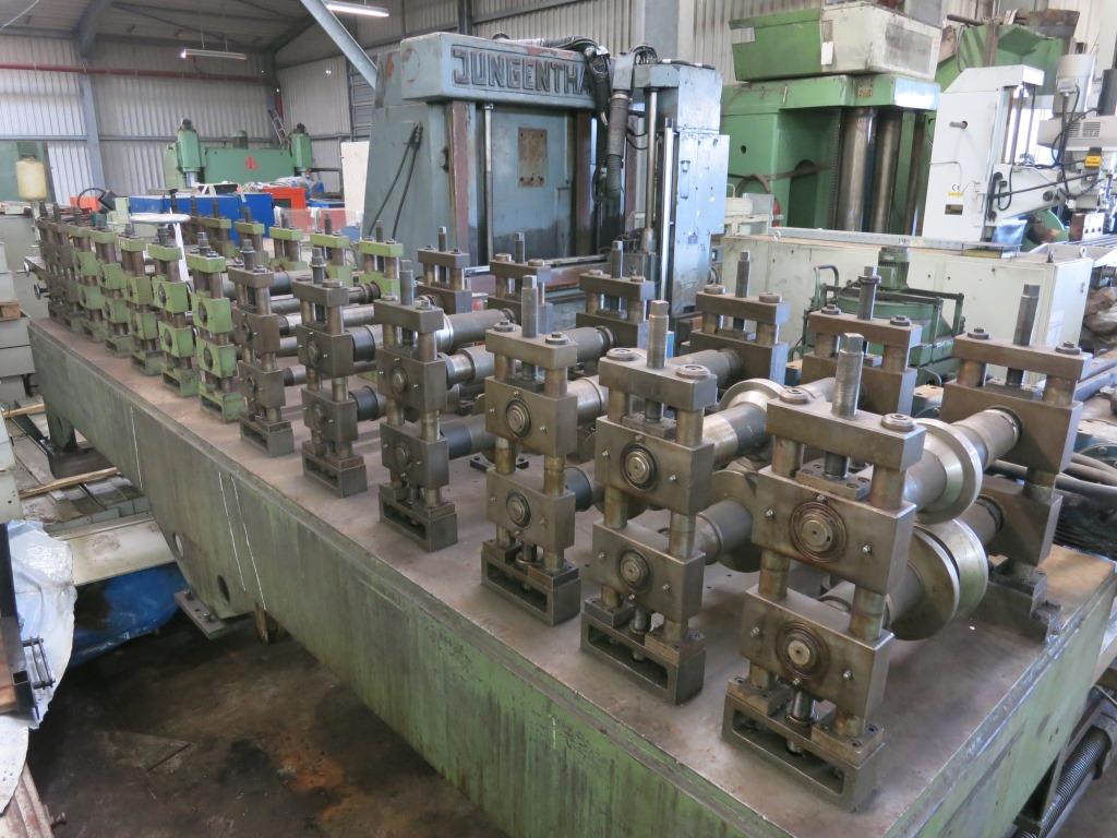 sheet width: 480 mmplate thickness: 3 mmstations: 13 total power requirement: kWweight of the machine ca.: 11 tdimensions of the machine ca.: 15,x2 mNumber of stations 13Number of straightening stations 1Waves 60 mmCenter distance, horizontal 310 mmCenter distance, vertical 110 - 250 mmSpeed approx. 11 m / min.Connected load approx. 20 kWUncoiler (without drive)- Coil- , inside 508/610 mm- Coil weight 3 tFlying hydraulic scissorsRoller set for hat profileThe techn. Data is manufacturer or operator information and therefore for usnot binding. We reserve the right to make an interim sale, it appliesexclusively our businessand conditions of sale.The data for this ad was created with ModulMWS - the software solution of LogoTech oHG.