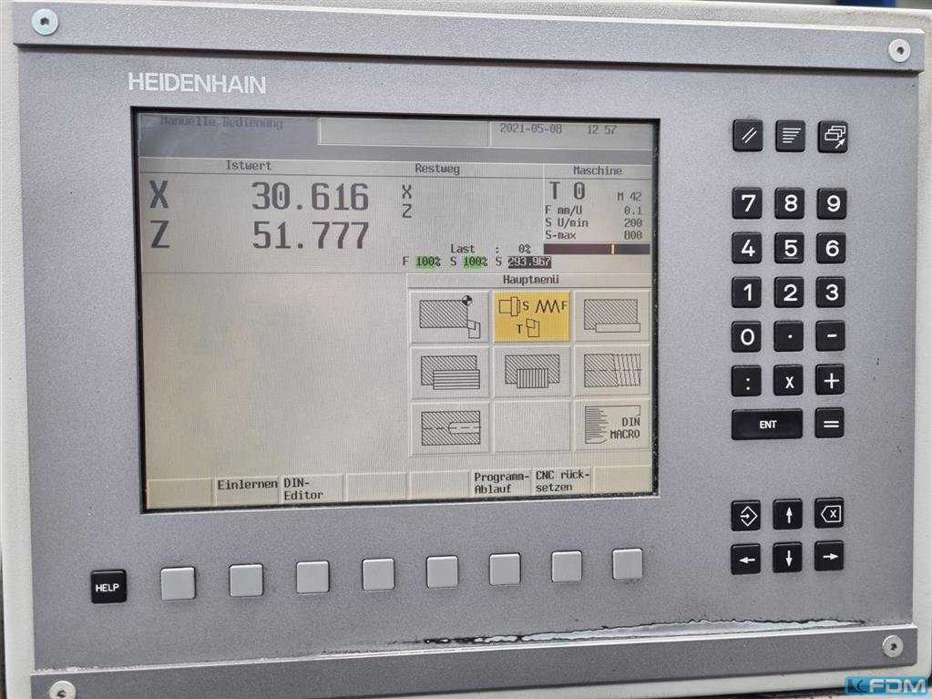 Código 81176 DESCRIPCIÓN Torno CNC Centro con 2 ejes Hacer P B R Modelo T 30 SNC x 3000 S/N 30 – S / 80 Año 1995 Control Heidenhain Manual Plus (1998) Distancia entre centros 3000 mm Oscilación máxima 630 mm Oscilación máxima sobre la diapositiva 330 mm Diámetro del husillo 105 mm Velocidad del husillo en 2 rangos stepless (en programa) 7 – 310 / 44 - 2000 rpm Potencia del motor 15 kW Carga conectada 33 KVA Peso de la máquina 6000 kg Accesorios 3 mandriles de 315 mm 1 fijo constante 1 apertura constante equipos de refrigeración La máquina de acondiciona está en buenas condiciones