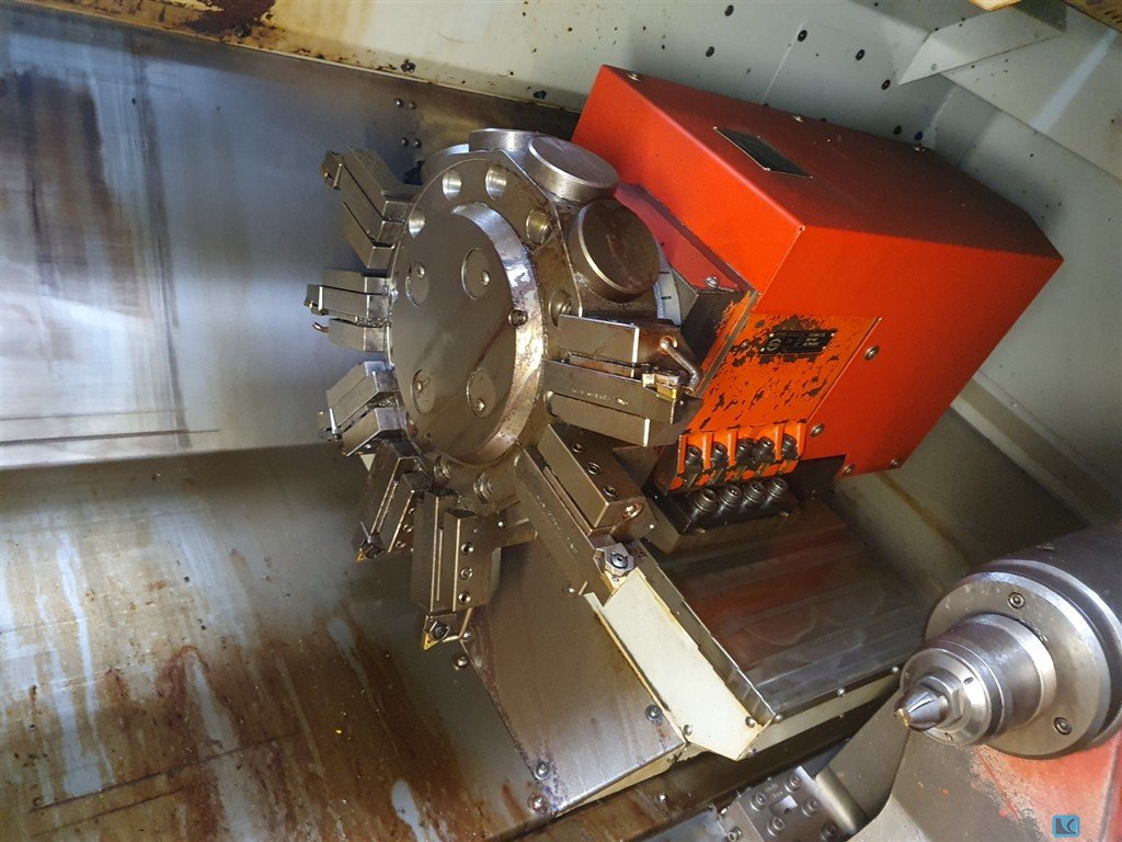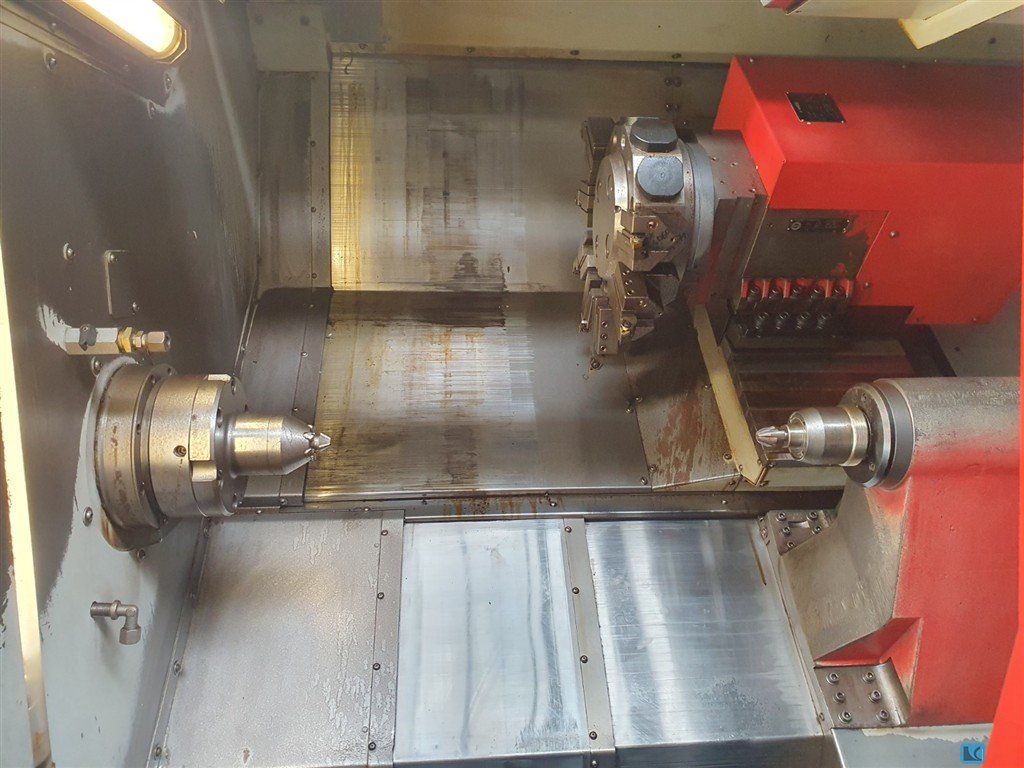 For sale Emco CNC double spindle lathe type Hyperturn 45. A very complete CNC lathe with left and right spindle, as well as an upper and lower turret. Both turrets have driven tool positions! The upper turret also has a Y-axis with 70 mm travel. Tool holder attachment VDI25, rod capacity left spindle is Ø 45 mm, maximum speed 7,000 rpm. Maximum diameter is Ø 300 mm. Maximum part diameter is 480 mm. The distance between the two spindles is 720 mm. Fanuc 18i-TB control. The machine is equipped with high pressure pump, chip conveyor with right ejection, parts catcher, manual collet devices, etc. Available from stock, subject to prior sale. The machine has a light layer of soot. This can be easily removed.