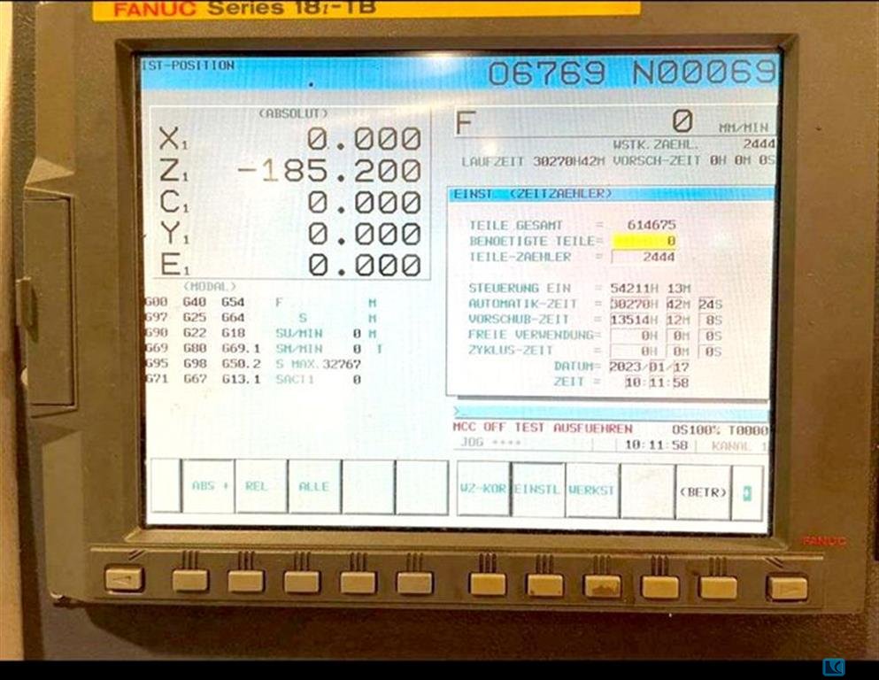 bar material dia.:65 mm turning length:644 mm turning dia. over bed:600 mm turning diameter over slide:430 mm y-axis:100 (+-50) mm turning speeds:2x 5.000 1/min positive location each:2x C-Achse, 0,001° Grad Sub spindle:ja/yes turret (x-stations):2x 12 VDI 30 Pos. driven tools:2x 12 Pos. turning speeds:2x 4.000 1/min control:FANUC 18 iTB total power requirement:30 kVA weight of the machine ca.:8 t dimensions of the machine ca.:3,5 x 2,5 x 2,3 m turning- milling center with Y-axis, collet device on main and subspindle, high pressure pumps 2x 14bar, parts catcher/conveyor, barloader ENTL 10-65, chip conveyor, lot of accessories approx. 54.500 hours "machine on", 30.500 h "automatic", 14.000 h "feeding"