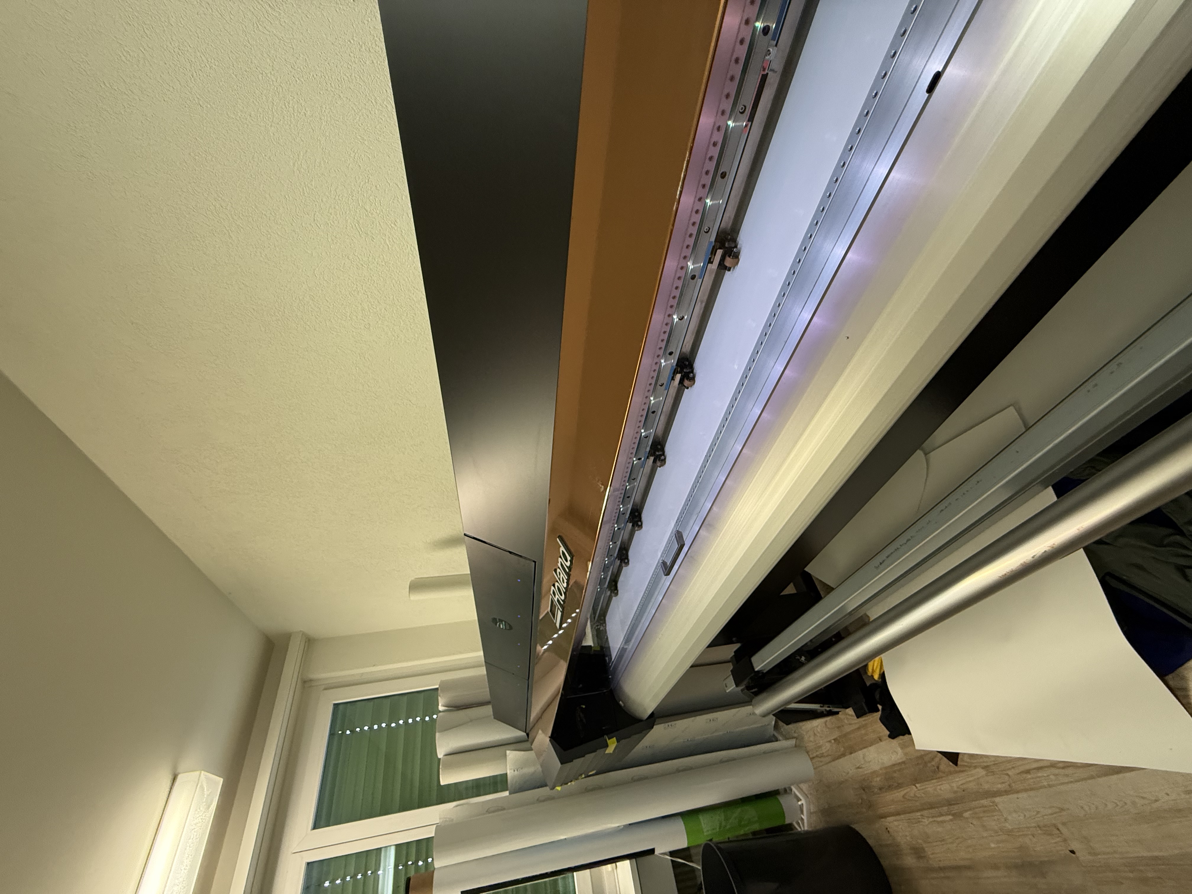 One HandTop ultraviolet flatbed printer is available. Print resolution X/Y: 1200dpi/1200dpi, max. material size: 1600mm/1000mm, max. material thickness: 100mm, print speed per hour Draft/Production/Quality: 36m²/27m²/20m², color system: CMYK. Machine dimensions X/Y/Z: approx. 3400mm/2200mm/1250mm, weight: approx. 500kg. Documentation vorhanden. An on-site inspection is possible.