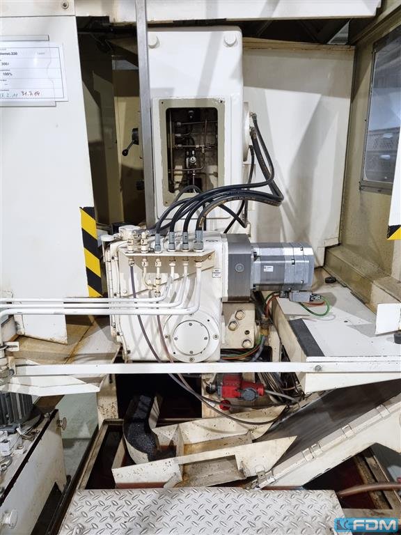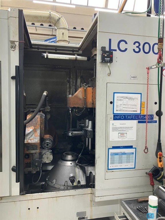 max. wheel diameter:300 mm max. module:7 weight of the machine ca.:15 t table turning speeds:100 U/min table diameter:180 mm hob turning speeds:750 U/min max. hob diameter:300 cutter length max.:230 mm Liebherr LC300 with loading automation Machine including counter holder The machine used to work with emulsion