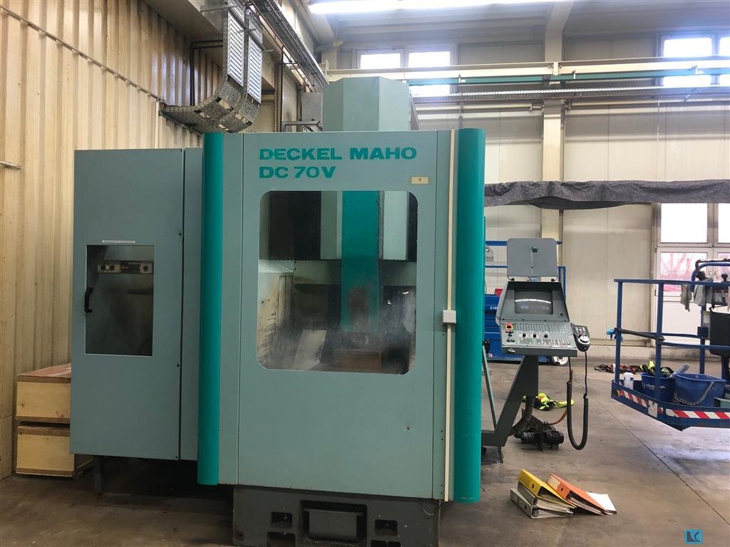 CNC Vertical Machining Center DECKEL MAHO DMC 70 eVolution With track control Heidenhain iTNC 530 Year of Make: 2007 Travel: X 750 Y 600 Z 520 Speed range: 0 – 18000 rpm infinitely variable (SK 40) With the following accessories: 2-axis NC swivel rotary table 700 mm x 500 mm clamping surface 2-fold pallet changer Vertical tool changer with 92 magazine positions ( SK 40 ) Full protection cabin with sliding doors and interior lighting Electronic handwheel 3 D Probe Heidenhain TS 640 Tool measurement in the work area (BLUM Laser) Operating mode 3 + 4 IKZ 40 bar Rotoclear Conveyor Coolant Setup Swarf Spray Gun 4 Height Adjustable Machine Shoes Operating instructions