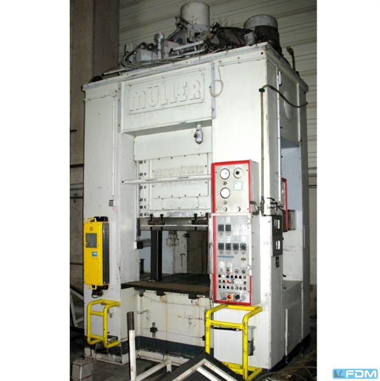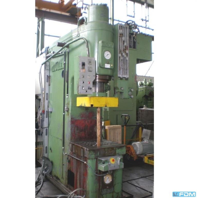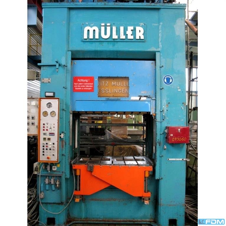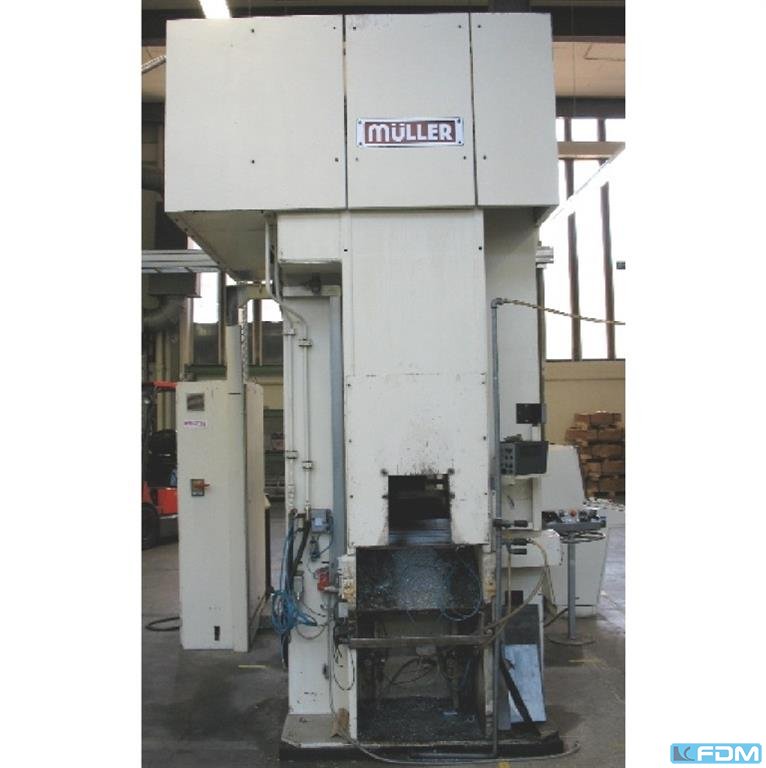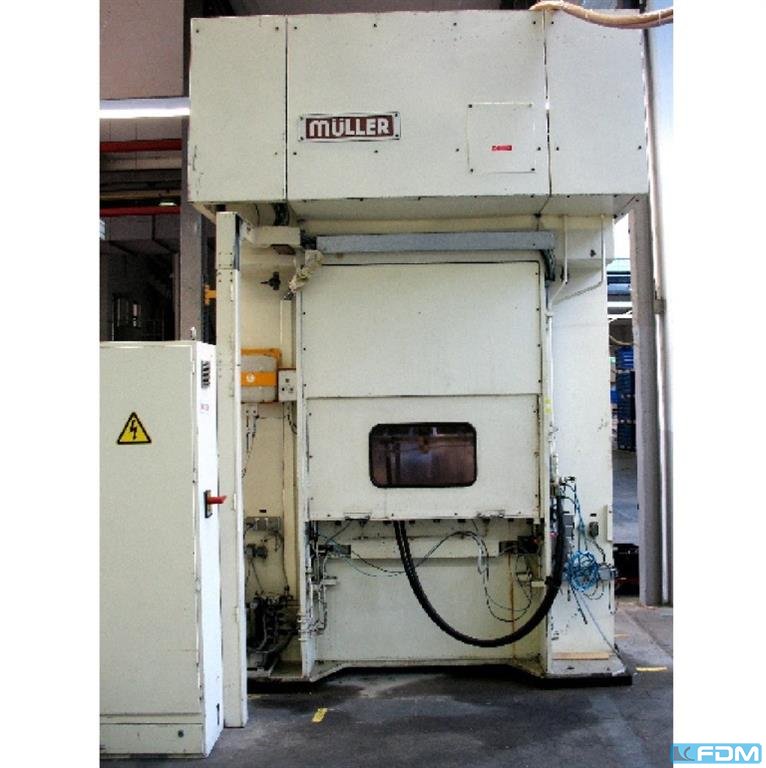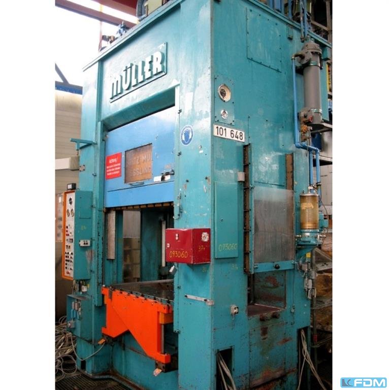 a hydraulic single-stand drawing press Müller model CLZ.100.1.34, Y.O.M. 1994, good condition, with UVV, Siemens S7 screen control, throat gap 400 mm, installation height 800 mm, table surface 800 x 730 mm, stroke 600 mm, drawing cushion 40 to., drawing cushion stroke 200 mm.