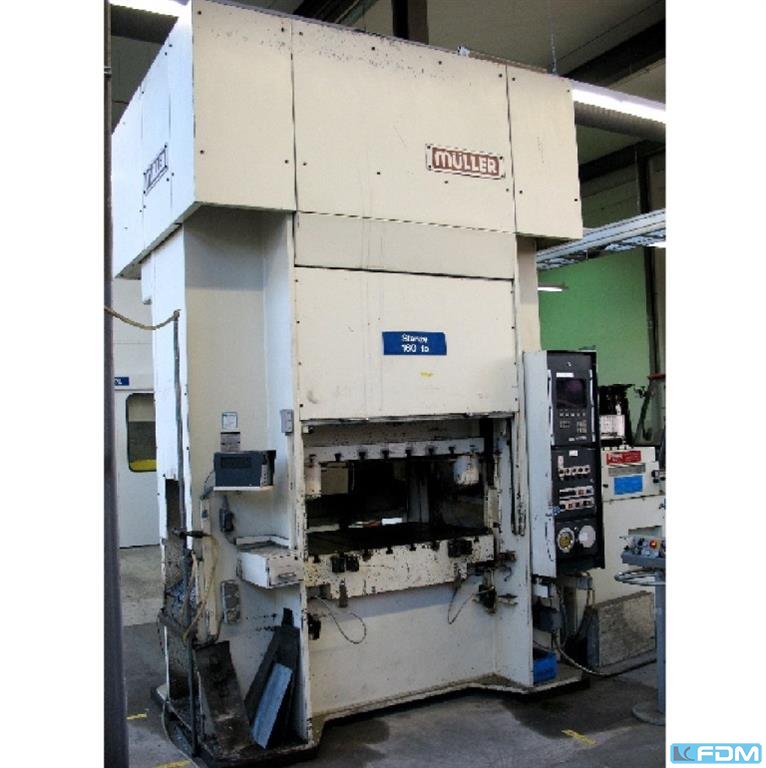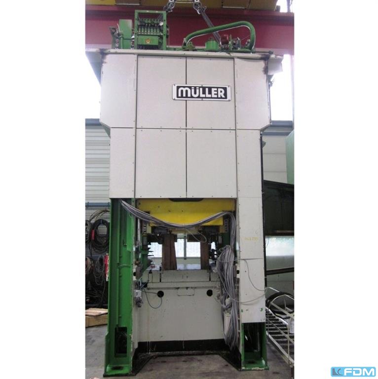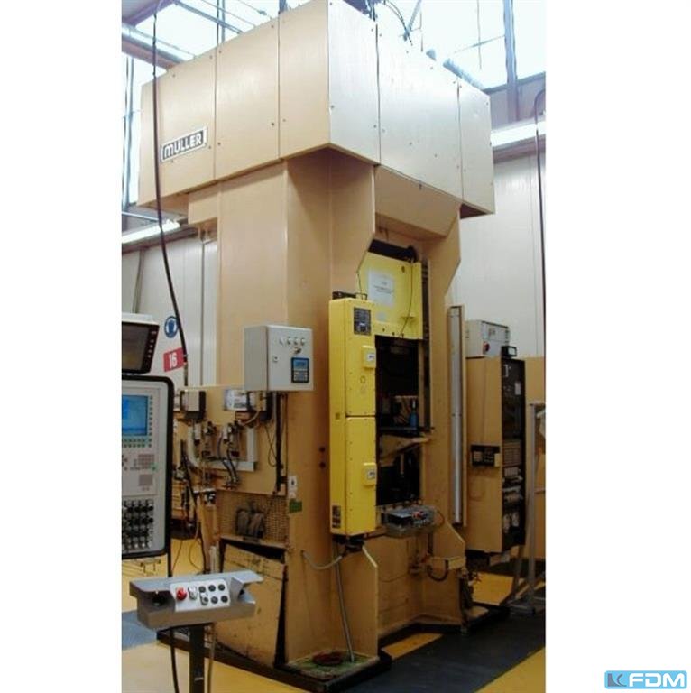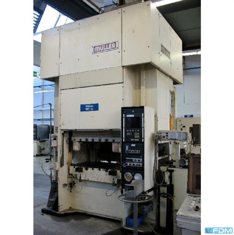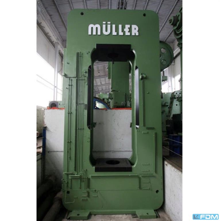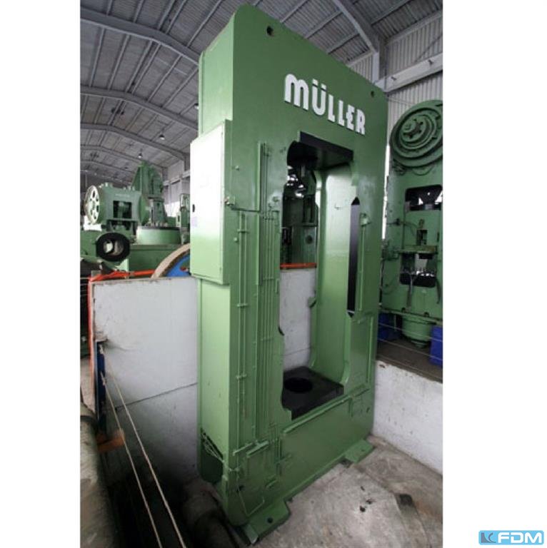 a hydraulic single-stand drawing press Müller model CLZ.100.1.34, Y.O.M. 1994, good condition, with UVV, Siemens S7 screen control, throat gap 400 mm, installation height 800 mm, table surface 800 x 730 mm, stroke 600 mm, drawing cushion 40 to., drawing cushion stroke 200 mm.