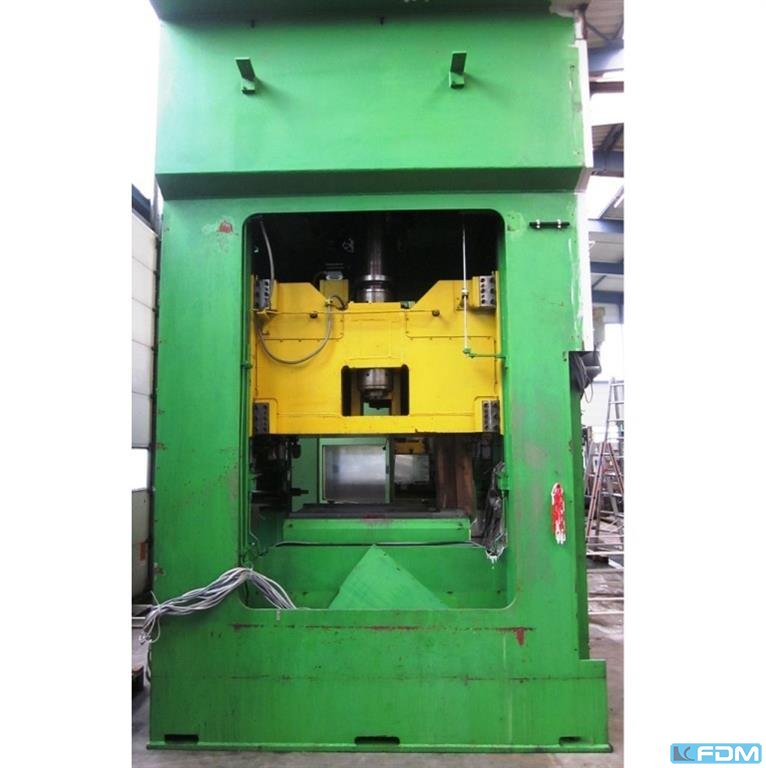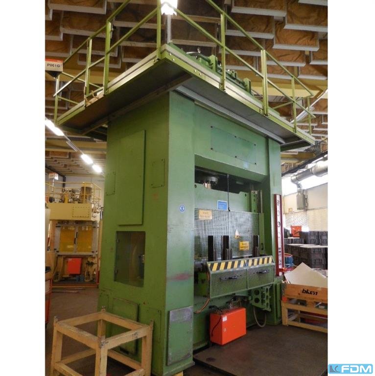 pressure:2000 t distance between columns:975 mm stroke:400 mm distance table/ram, max. stroke up, adjustment up:1000 mm table surface area:1015 x 1050 mm table height over floor:800 mm capacity of ejector in table:6,3 t ejector stroke in table:100 mm capacity of ejector in ram:65 t ejector stroke in ram:100 mm ram surface:975 x 1050 mm return capacity:150 t speed down:235 mm/s speed up:250 mm/s working speed:5 - 20 mm/s oil volume:4000 l height over floor:3,65 m height beneath floor:3,75 m power requirement:194,0 kW weight:105,0 t dimensions (WxDxH):5,0 x 6,5 x 7,4 m