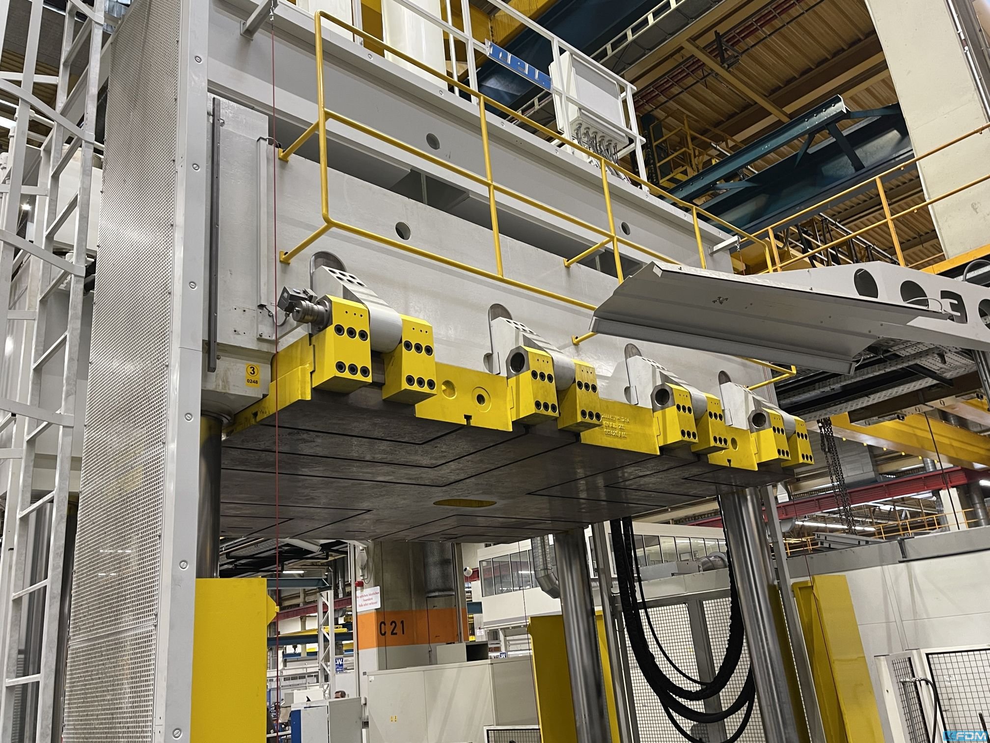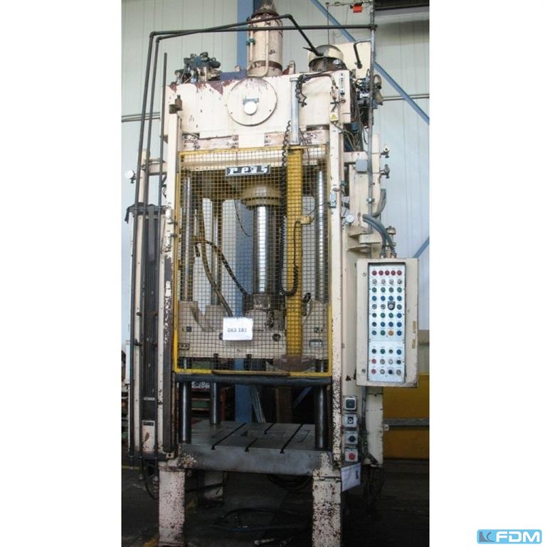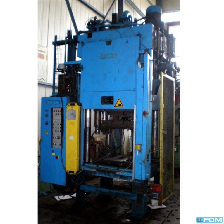 pressure:250 t table length:4000 mm table width:3000 mm Controls:SIEMENS SIMATIC C7 PRESS DESIGN:. - frame design : 4 column :. - moving bolster : yes :. PRESS FORCES:. - total force (nominal):250 to PRESS TABLE:. - clamping surface (left-right):4000 mm - clamping surface (front-back):3000 mm - tool weight max.:100000 kg - number of T-slots:12 - distance between T-slots:375 mm - height above floor level:390 mm RAM:. - clamping surface (left-right):4000 mm - clamping surface (front-back):3000 mm - number of T-slots:12 - distance between T-slots:375 mm - stroke:2900 mm - tool weight max.:50000 kg RAM (HYDR. PRESS):. - number of main-cylinders:1 - approximation velocity max.:180 mm/s - working velocity max.:50 mm/s - restoring force of ram:95 to TOOL ASSEMBLY DIMENSIONS:. - distance table - ram max.:2750 mm - distance between columns (H-frame):4100 mm - Free passage be ...