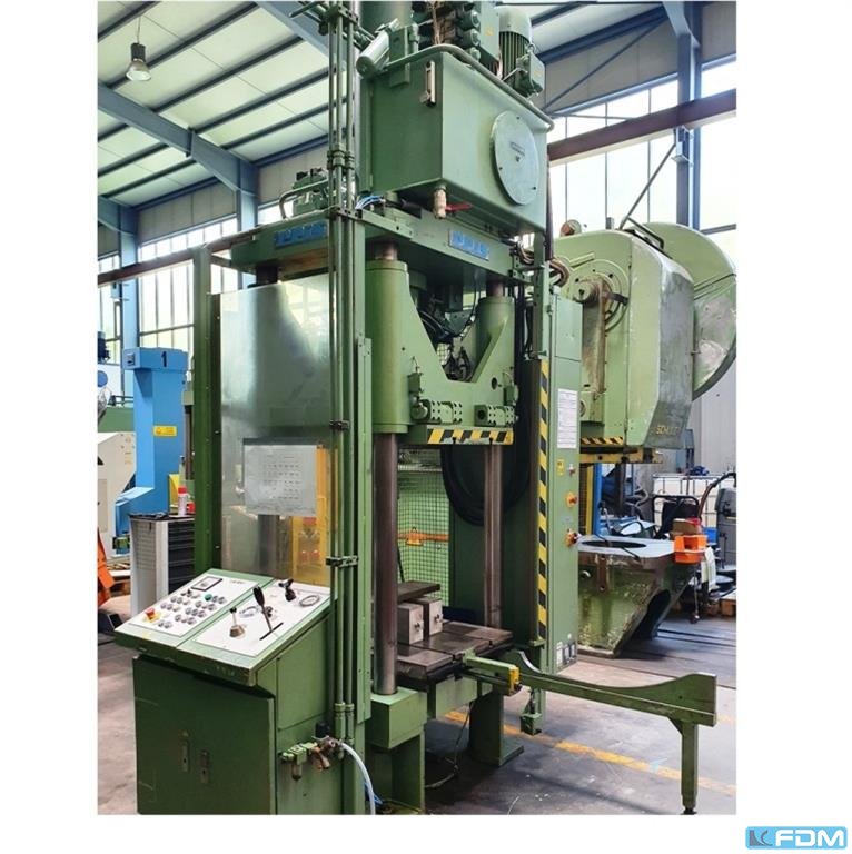 DIEFFENBACHER PO 500A hydraulic press was built in 1978 in Germany by J. Dieffenbacher GmbH & Co. The machine has been regularly maintained and upgraded throughout its service life. In 2017, a major upgrade was carried out, which included replacing the electrical cabinet, installing light curtains and adding a SIEMENS SIMATIC HMI TOUCH touchscreen operator panel. The seals and electrical system were also replaced. The DIEFFENBACHER PO 500A is the perfect choice for even the most demanding metal forming operations. It enables the execution of such operations as die stamping, punching, calibration of forgings and hot and cold bending. All these machining processes are performed with a high press force of up to 500 tonnes, which, combined with a highly dynamic slider, guarantees the best machining results. The machine is also characterised by a rigid body made of thick steel plates and a ...