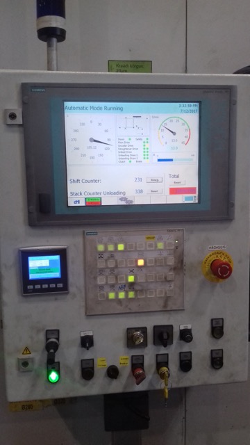 CONTROLS PLC SIEMENS S7 PRESS DESIGN drive system: knuckle-joint frame design: H-frame, monoblock openings in uprights: yes number of suspensions: 2 feedstock transport direction: left to right PRESS FORCES total force (nominal): 315 to nominal work capacity: 38 kNm PRESS TABLE table surface (left-right): 2000 mm table surface (front-back): 1200 mm thickness of bolster plate: 200 mm SLIDE slide force: 315 to table surface (left-right): 1995 mm table surface (front-back): 1100 mm stroke: 160 mm stroke rate (max.): 80 /min SLIDE (MECHAN. PRESS) slide adjustment: 140 mm stroke rate (min.): 20 /min stroke rate (max.): 80 /min main drive power: 90 kW TOO ...