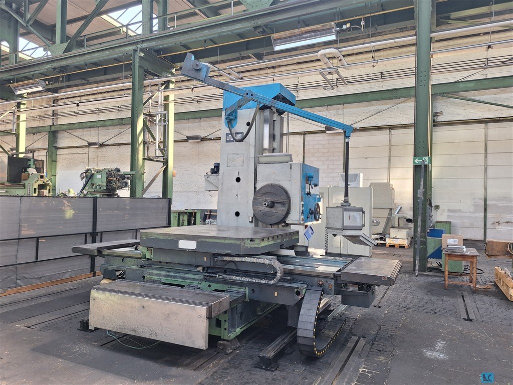 spindle diameter:130 mm spindle diameter:130 mm x-travel:2190 mm y-travel:1520 mm z-travel:1000 mm w-axis:1075 mm table surface area:2000 x 1800 mm workpiece weight max.:8000 kg spindle turning speed range:4,5 x 900 U/min spindle taper: ISO:50 faceplate turning speed range:4,5 x 180 U/min faceplate diameter:785 mm rapid traverse::5000 mm/min total power requirement:40 kW weight of the machine ca.:35 t dimensions of the machine ca.:5,5 x 6,9 x 5,2 m Machine retrofit and overhould with TNC 360 Heidenhain in 2023 and stepless spindle speeds - table indexing 4 x 90° - facing head 785 mm - exhauster - various arbors and tooling