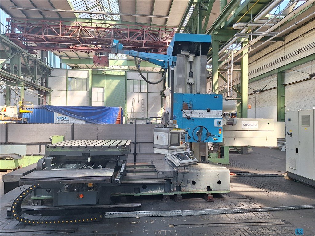 Ref. -No.: 10022 Manufacturer: UNION Year of construction: 2001 Type of control: CNC Control: Heidenhain-Steuerung TNC 310 Storage location: Halberstadt Country of origin: Deutschland X-Travel: 2000 mm Y-Travel: 1600 mm Z-Travel: 2000 mm Machine length: 6950 mm Machine width: 4685 mm Machine Height: 3885 mm Table Height: 1050 mm Spindle Diameter: 110 mm Spindle Taper: ISO 50 Table Dimensions (Lengthxwidth): 1400 x 1600 mm Faceplate speed: 5,6 - 224 RPM Spindle Speed: 5,6 - 1120 RPM Metric thread feeds: 1,25 - 56 mm Drive Capacity - Spindle Motor: 40 kW Weight Of The Machine Ca.: 25 t Bore Depth: W 800 mm Further information: with facing slide 13 inch thread feeds 1 1/8 - 28 Gg / 1 “ YOM: 1990/ Retrofit: 2001