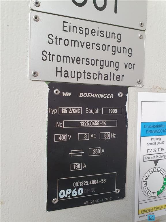 Description Lead and pull spindle lathe VDF Boehringer Göppingen Details Height 1,400 mm Width 1,300 mm Length 4,150 mm Bed width 480 mm Bed height 850 mm Bed length 3,000 mm Face plate Ø 600 mm Forkardt Wedge Bar Chuck Ø 315 mm max. workpiece lengths 2,000 mm Turning diameter over bed 680 mm Turning diameter over support 480 mm Center height 340 mm Drive power 6.5 / 10 kW Lynette Ø 320 mm Multifix holder size C with 5 cassettes