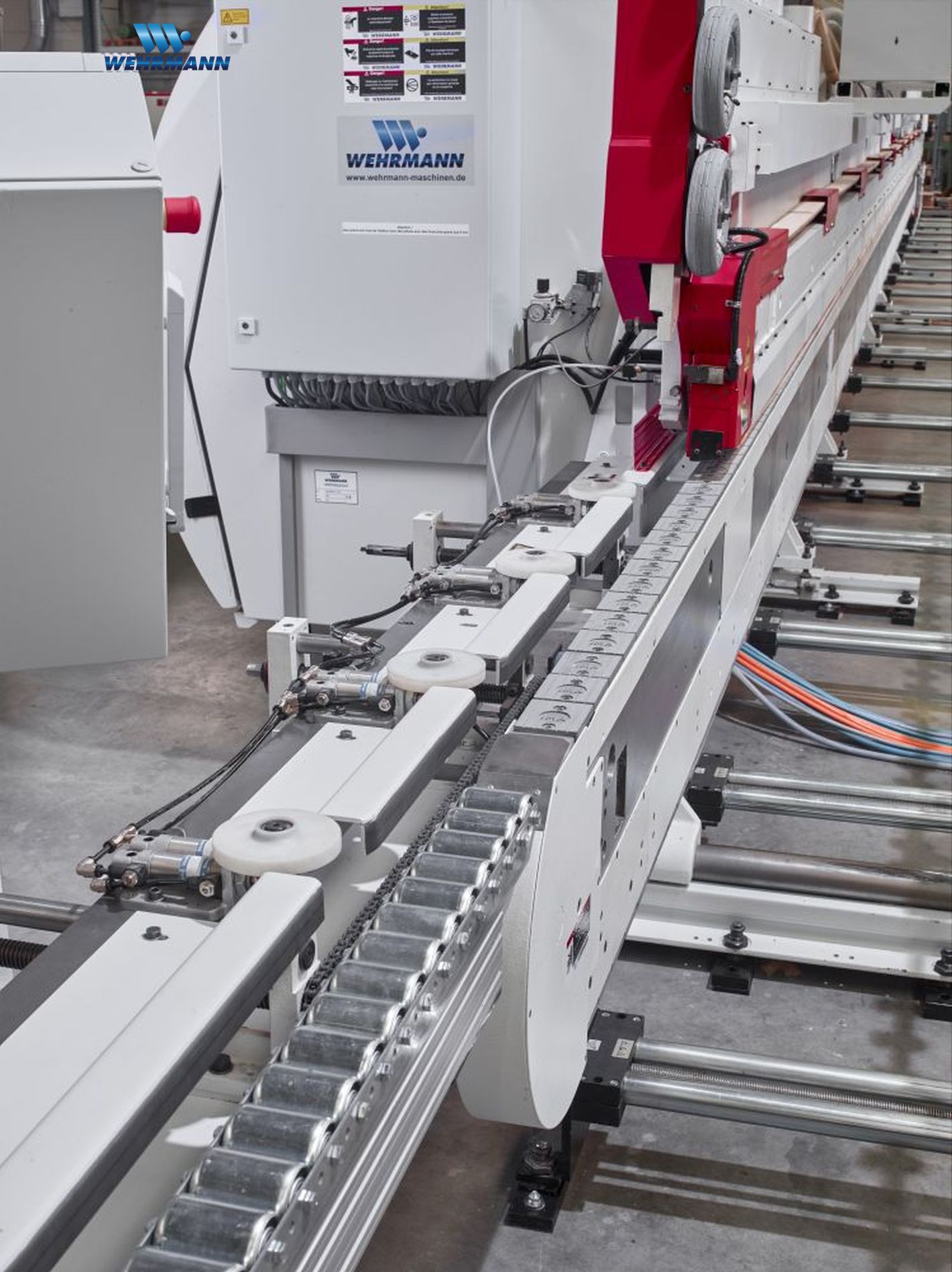 Single sided postforming edge processing machine Brand: WEHRMANN Type: Combima DPF New with 12 months warranty Example with typical equipment; almost each equipment is possible. Please discuss your requirements with us Technical data: Machine control: BECKHOFF route control with 15? Touch-Screen for pre-selection of units and for saving programs. The workpiece transport via precision roller chain R75 with height adjustable top pressure. Feed speed: max. V=6-30 m/min. frequency controlled drive, Top pressure: Motorical height adjustment via axis adjustment in program Right hand site equipped with 1 unit, width adjustment via NC axis: 1 Pre-milling unit With 1 motor with vertical shaft, 400 V, 12,5 KW, 100 Hz, 6000 rpm. Motor shaft Hydro D40 Swivable 90 - 180 degrees, move in/out for use Left han ...