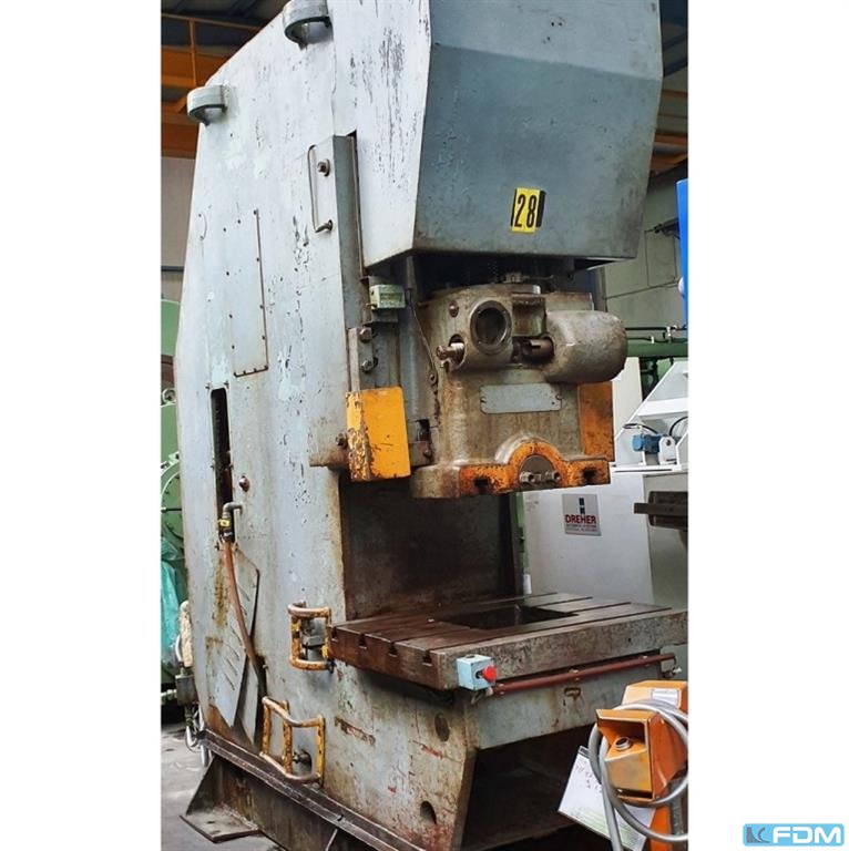 pressure:250 t throat:450 mm stroke:36 - 126 mm no. of strokes:40 /min distance table/ram, max. stroke up, adjustment up:525 mm table surface area:1000 x 750 mm hole in the table:400 x 360 mm table height over floor:1000 mm ram surface:600 x 500 mm ram adjustment:111 mm power requirement:19,0 kW weight:13,5 t Dimensions (WxDxH):1,3 x 3,2 x 3,35 m clutch:pneumatic overload protection in ram:mechanical ram adjustment:motoric