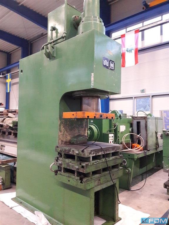 Sale due to switch to eccentric press Pressing force 100 tons Loading depth 360 mm Stroke 500 mm Daylight 800 mm Plunger area 530 x 400 mm Table height above floor 710 mm Working speed 10mm/sec Approach speed 150 mm/sec Return speed 150 mm/sec Required power 17 kW Dimensions L x W x H 1,400 x 2,000 x 3,200 mm Weight of the machine approx. 5.1 t Year of manufacture 2001 Price is net, VAT can be claimed. Loading facilities available All information without guarantee