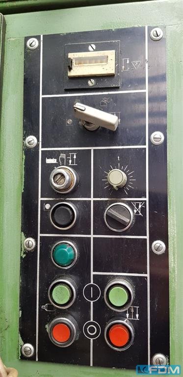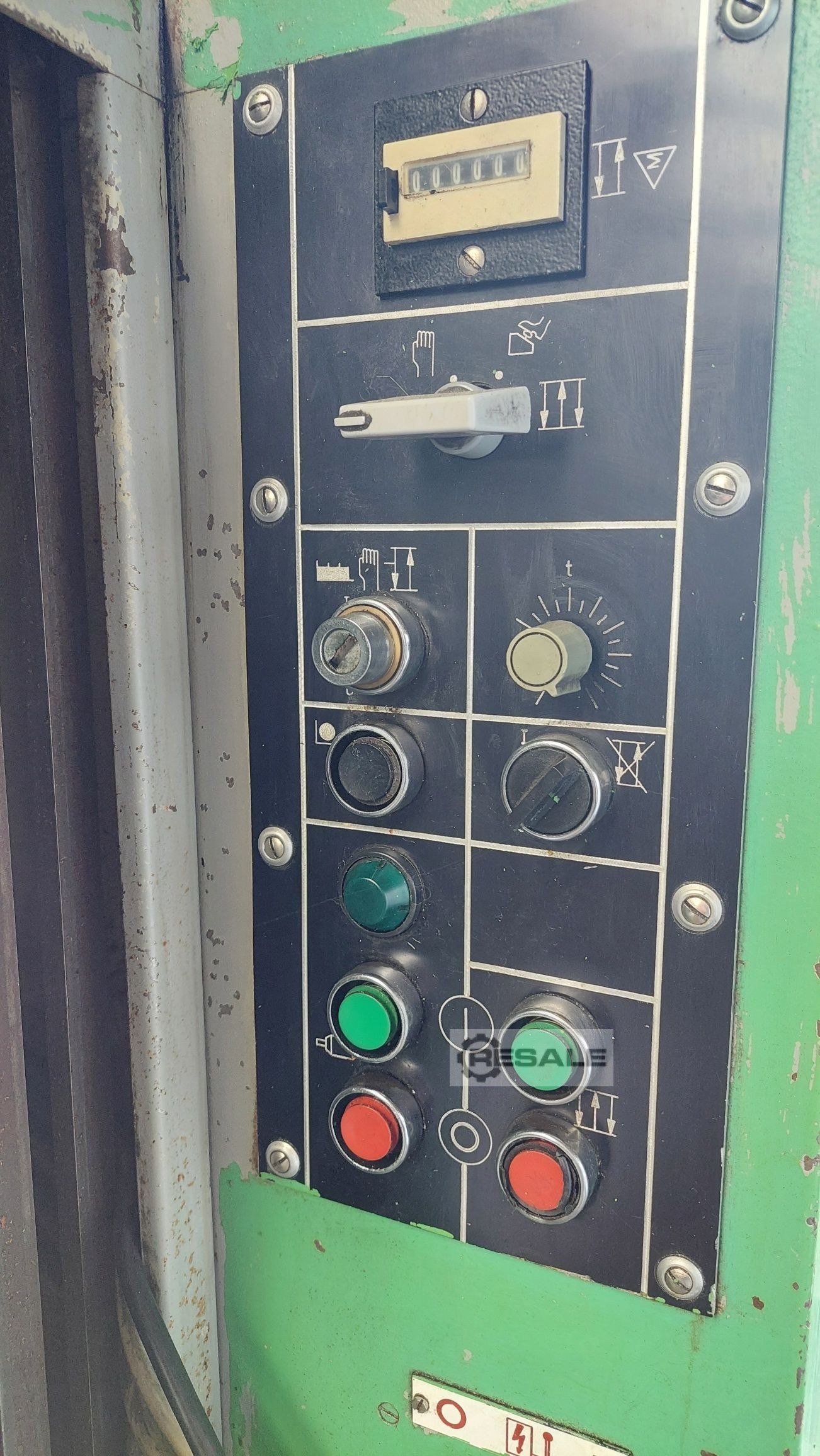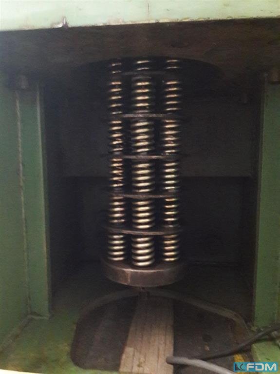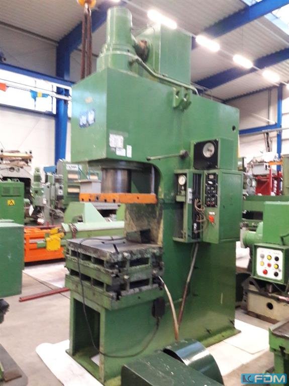 Offer 25374 Specifications: - Max. pressing force 100 t - Max. ram stroke approx. 500 mm - Lifting speed 25 mm/sec. - Return 125 mm/min - Installation height approx. 1000 mm - Projection to the middle of the ram 380 mm - Pusher clamping surface 530 x 400 mm - Plunger clamping pin 40 mm - Table size 750 x 560 mm - Table hole / through hole in the table 200 mm - Table height above floor 720 mm - Oil filling quantity approx. 200 ltr - Drive 400 V / 11 kW - Space requirement approx. W 1150 x H 3250 x D 1850 mm - Weight approx. 4600 kg